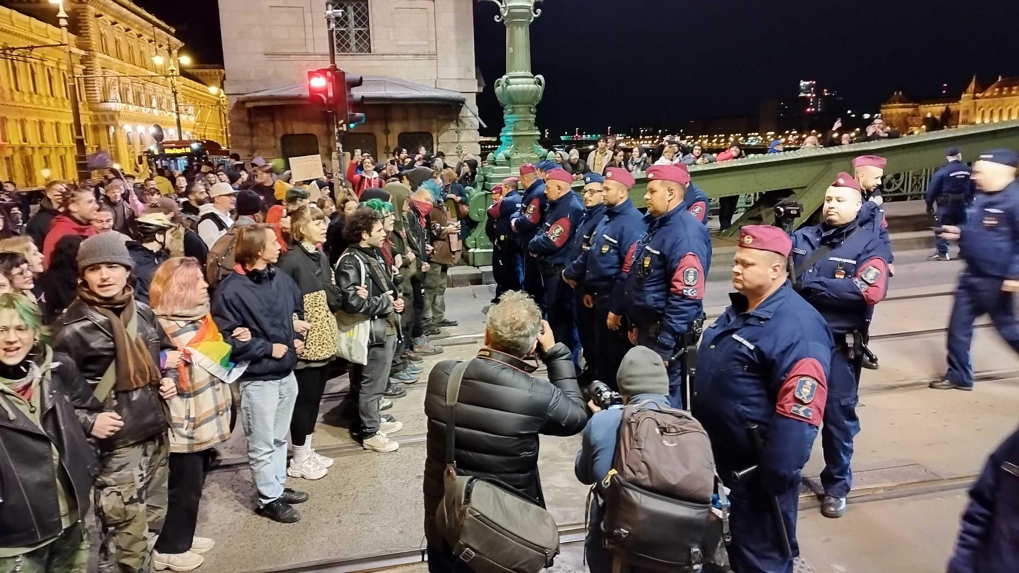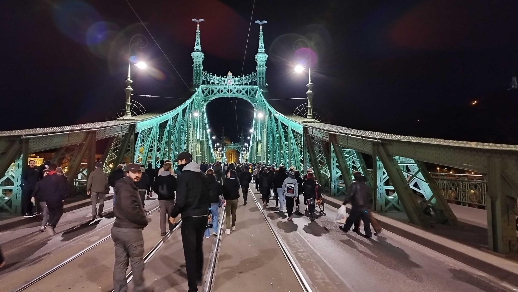 A technofasizmus ellen tüntettek az Erzsébet hídon, ahonnan sokan a Szabadság hídra mentek, aztán a Petőfi híd felé, amit végül nem sikerült elfoglalni. A Szabadság hídon tíz óra körül újraindult s forgalom, az Erzsébet híd hajnali 4-ig a tüntetőké marad. Mátyus László képriportja.