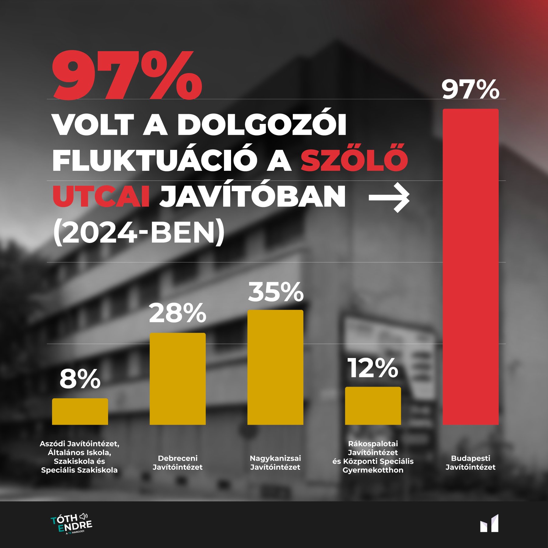 A Szőlő utcai javítóintézetben 2024-ben elérte a 97 százalékot a kilépő dolgozók aránya – közölte Tóth Endre momentumos politikus, aki közérdekű adatigényléssel jutott hozzá az információhoz. Szerinte az extrém fluktuáció egyértelműen súlyos vezetői és intézményi válságra utal, amelyre sem a fenntartó Szociális és Gyermekvédelmi Főigazgatóság (SZGYF), sem a Belügyminisztérium nem reagált érdemben.