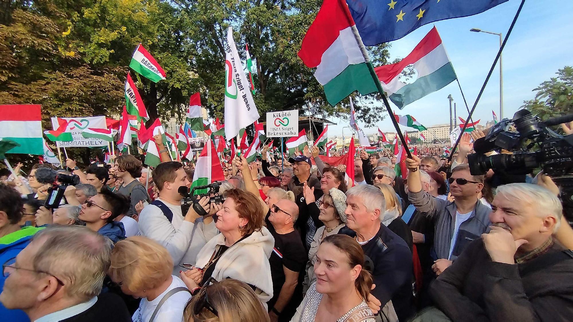 Résztvevők a Tisza Párt 2024. október 23-i, Bem-szobornál tartott rendezényén. Fotó: Mátyus László/Klubrádió