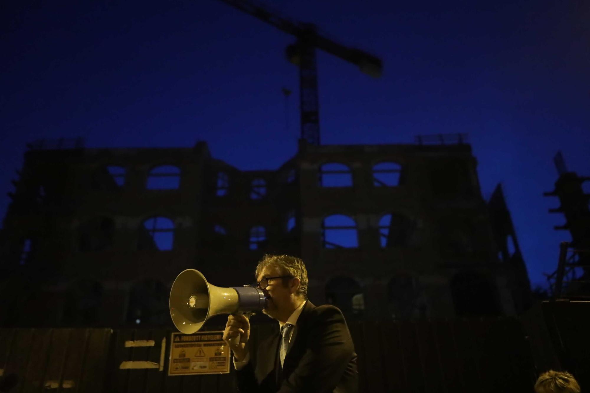 A Kossuth téren le van takarva a minisztérium épülete, de egy mellékutcából látható, hogy milyen állapotban van. A tüntetés végén Hadházy újra párhuzamot vont Hatvanpusztával és elmondta, normális országban már megakadályozták volna az épület további bontását.