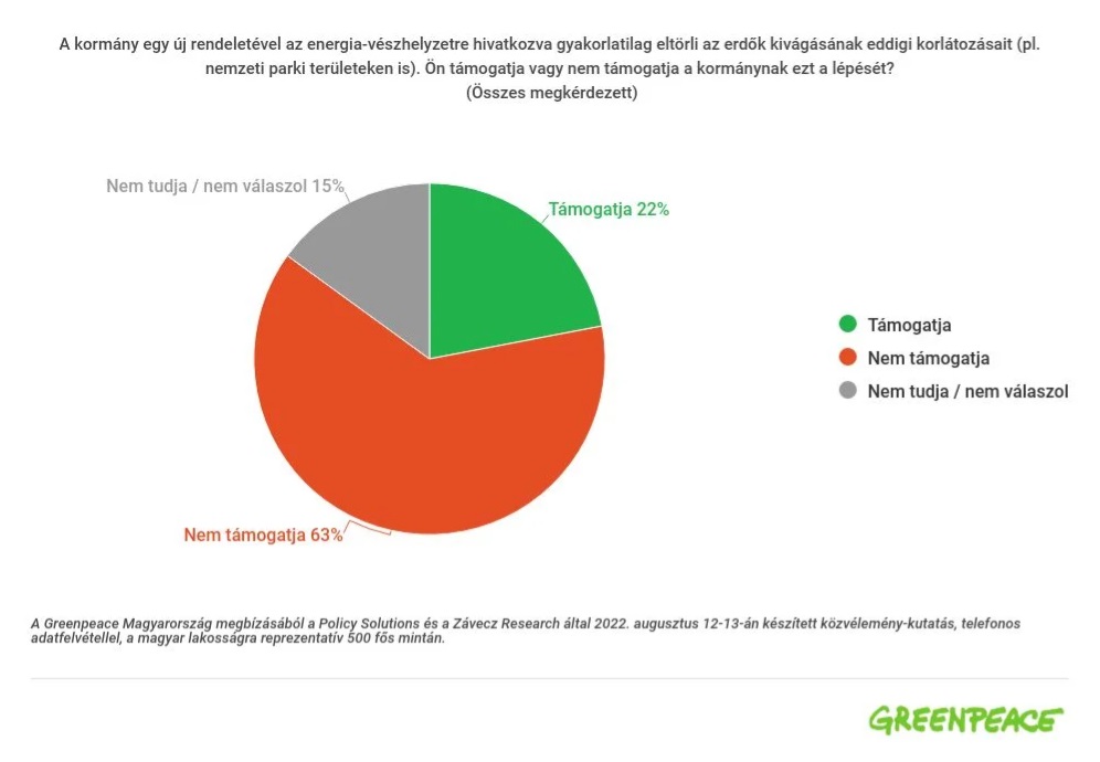 A zöldszervezet reprezentatív, 500 fős közvélemény-kutatása alapján egyértelmű, hogy a magyarok többsége elutasítja a tűzifa-rendeletet. A válaszadók közel kétharmada (63%) nem tartja elfogadhatónak a fakitermelés eddigi korlátozásainak eltörlését az energia-veszélyhelyzetre hivatkozva, és csupán minden ötödik ember (22%) mondta azt, hogy szerinte ezzel az intézkedéssel kezelhetők lesznek a jelenlegi energiaellátási problémák. A megkérdezettek 15%-a nem tudott vagy nem akart véleményt nyilvánítani az intézkedéssel kapcsolatban.
