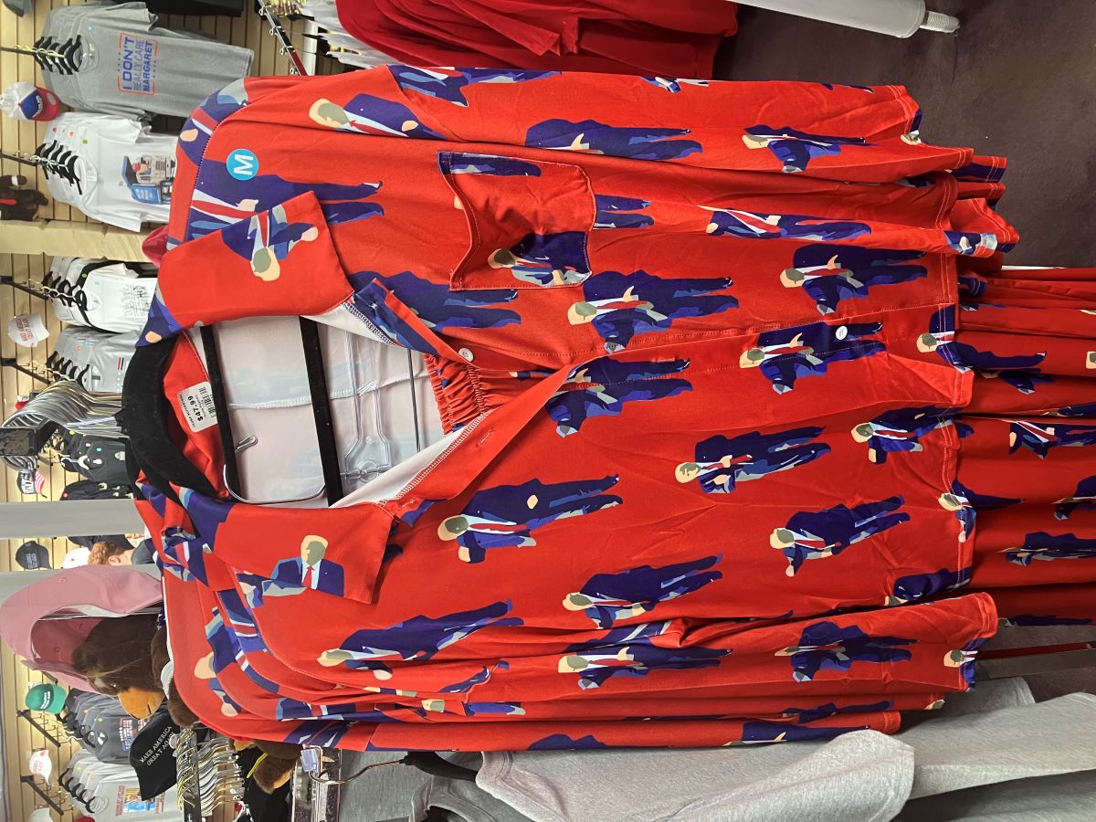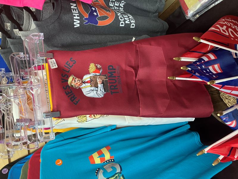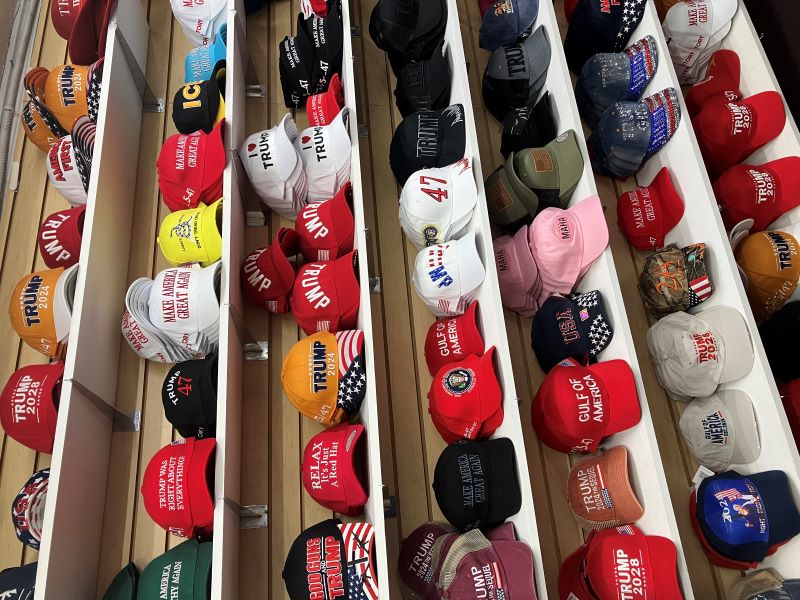 6 év körüli kislány érdeklődik a szüleitől, mi az hogy fejbólogató bábu… Trump sok változatban és öltözetben, pózban ingatja rugósan a fejét, ami nagyon tetszik a kislánynak. Két-dolláros és 50-es Trump fake pénzes dobocskák, aminek furcsasága, hogy a nyomtatás éve 2020. Hisz akkor éppen elvesztette a választást. De hát ő, és rajongói tábora egyáltalán nem így élte meg azt az elnökválasztást, amelyben Bidenhez szegült a szerencse. Mindenesetre zászlók hirdetik felirattal: elcsalt választás. Egy baseball sapkán: Trumpnak mindenben igaza van. Csecsemő ruha a Fehér Ház előtt karba tett kézzel álló Trumppal. Felirat: Apuci otthona. A piros férfipizsamán hemzsegnek a kis Trumpok, többféle pózban. A konyharuhán ez a szöveg áll: Fries vs Lies – azaz Sültkrumpli vagy hazugságok. A mekis krumplit maga Trump kínálja. Bőven vannak még áruk a Trump Elon Musk háború előtti időkből is, az egyik pólón a világ leggazdagabb emberét a 90-es évekből ismert Edward Scissorshands film szereplőjeként látjuk viszont, mint ollókezű Elon. Szépen megmunkált öngyújtó is van DOGE felirattal, pedig hát az Elon Musk-féle takarékossági program, a DOGE sok áldozatot szedett, sokak életét döntötte nyomorba. S aminek betudhatóan a Tesla ma – mondhatni – romokban, a tüntetéseken felgyújtott, megrongált autók látványa letörte a Tesla részvények árfolyamát is.