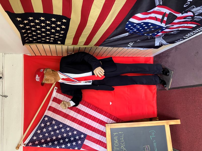 A bejáratnál Madame Tussaud ihlette Trump fogad viasz kivitelben. Ökölbe szorított kézzel jelzi, rajta senki nem fog ki. Interjúk Tennesseeből és Georgia államból.