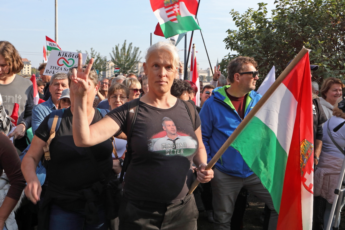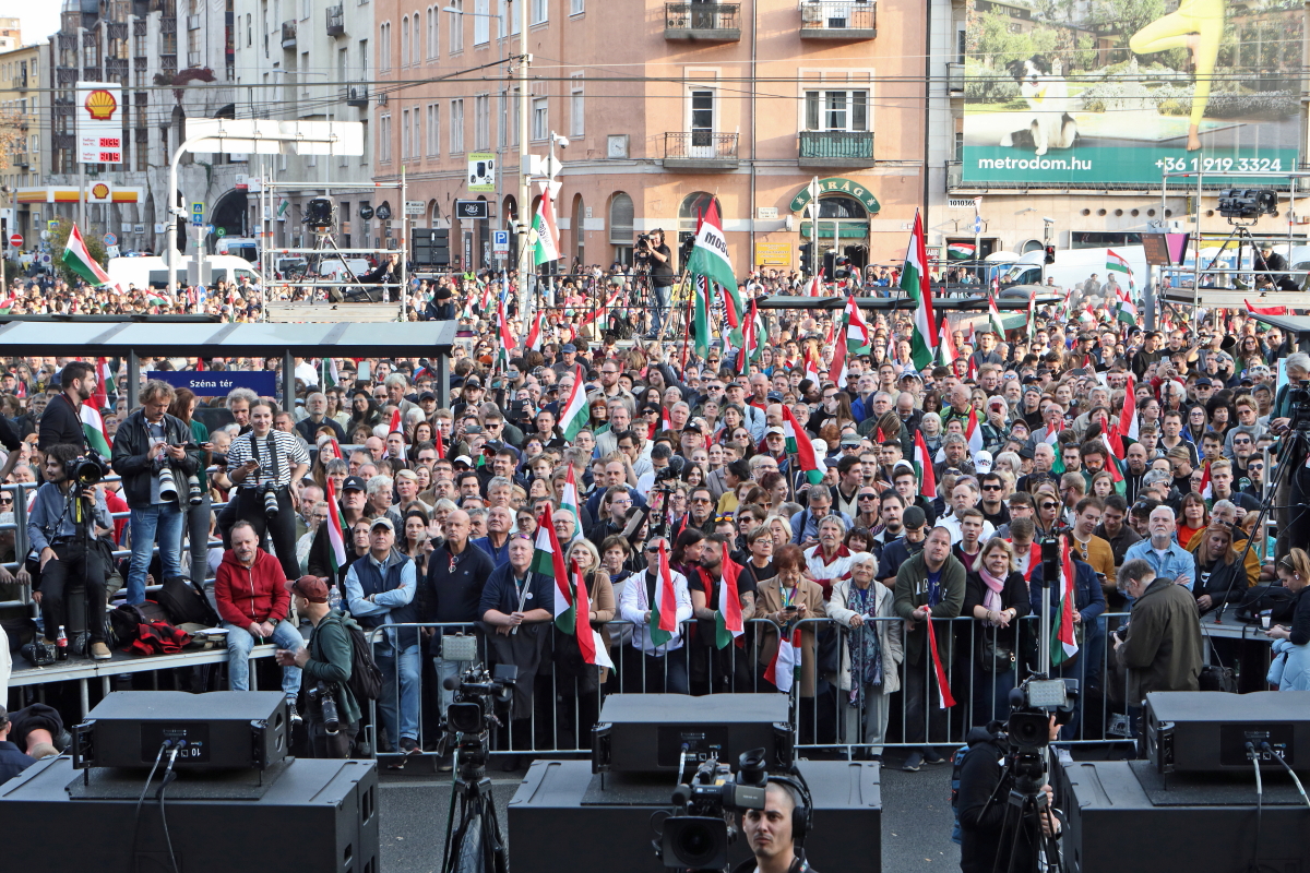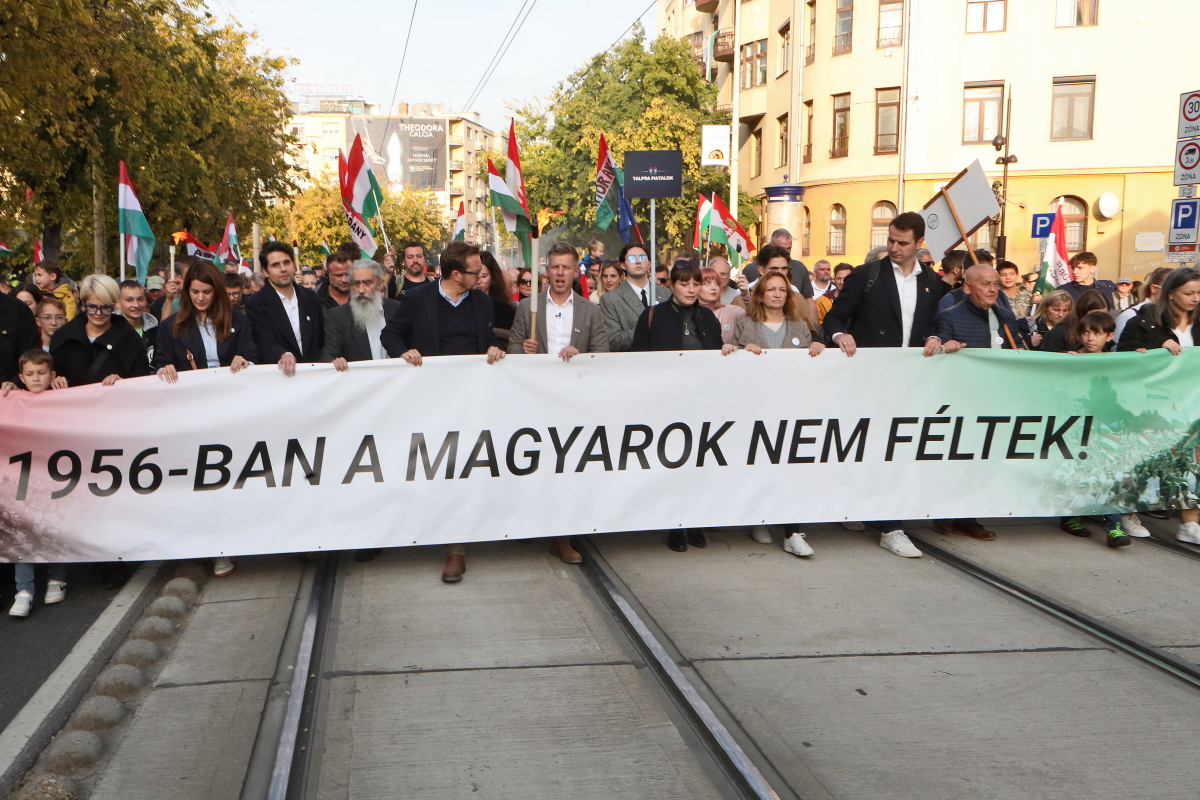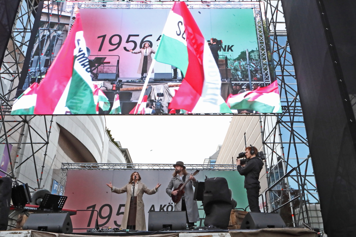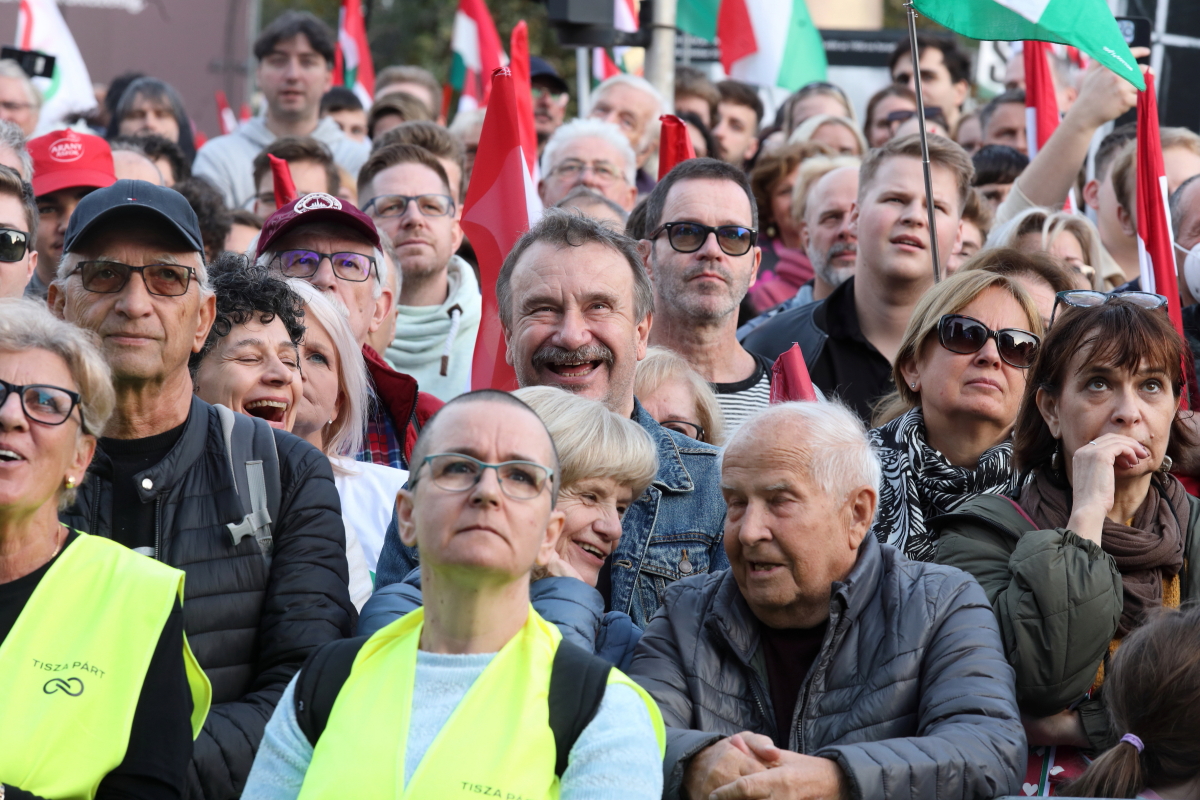 Több tízezer demonstrálóval, köztük a színpadon számos művésszel tartott október 23-i utcai ünnepi rendezvényt a Tisza Párt. Az esemény hangulata és szónoklatai a tizennégy éve folyamatosan kormányzó Orbán Viktor hatalmának közeli megdönthetőségéről szóltak. Ezt a várakozást látszik igazolni sokak számára a Tisza Párt felmérések szerinti folyamatos erősödése, és különösen egy aznap nyilvánosságra került közvélemény-kutatási eredmény, amely a biztos szavazók körében, ha hibahatáron belül is, de már a Tisza előnyét mutatja. A demonstrációról ITT olvashat bővebben, alább pedig az esemény képeit láthatja, arcokat a tömegből, országosan ismert művészeket a színpadon. Fotó: Mátyus László/Klubrádió