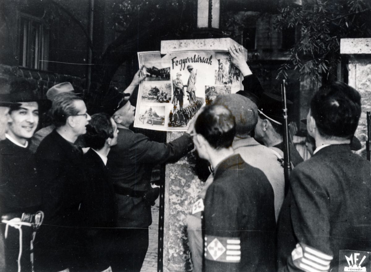 A beszélgetést a cikk elején, a fenti lejátszóra kattintva hallgathatják meg. Címlapi kép: Nyilaskeresztes honvédtisztek 1944. október 16-án a Sándor-palota előtt, Budapesten. Háttérben egy őrséget adó német ejtőernyős. Forrás: Bundesarchiv/Wikimedia Commons