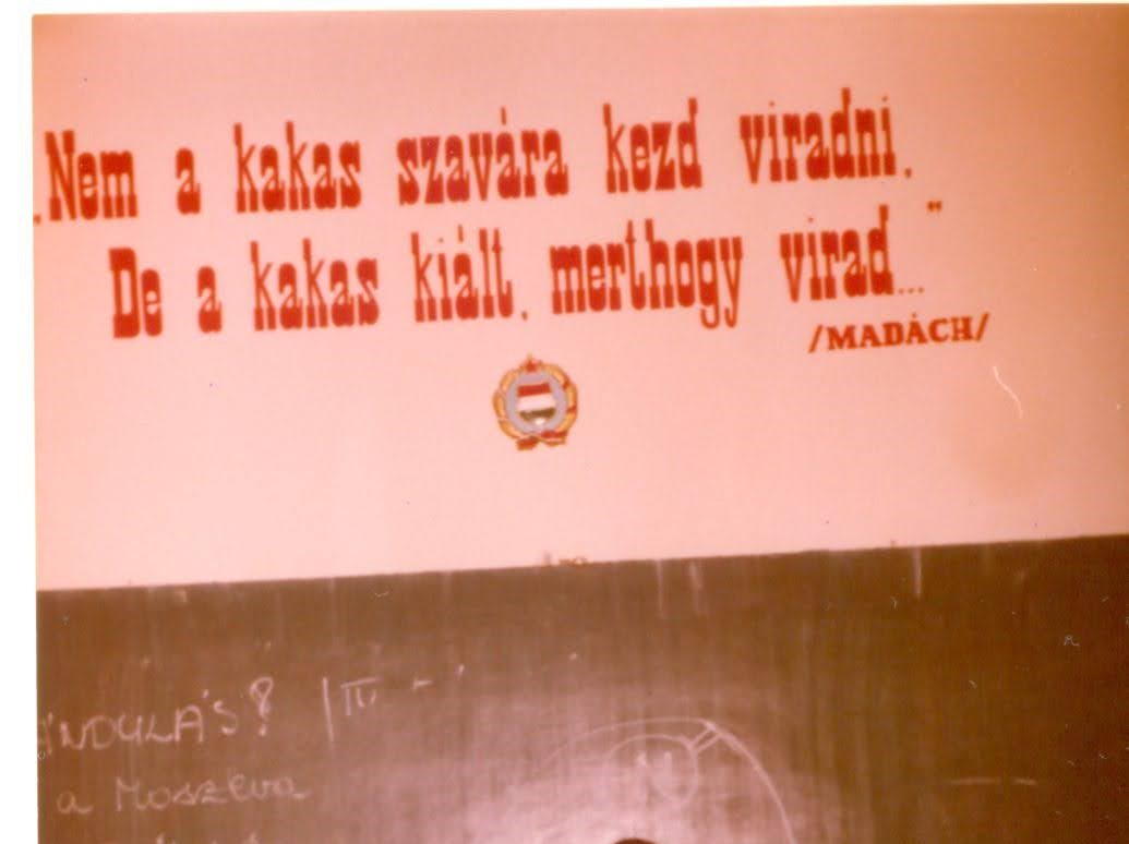 Abban az átkos, pangó kádári világban a mi osztálytermünk falára azt szögeztük ki – mert akkor is valamit muszáj volt –, hogy "Nem a kakas szavára kezd viradni, De a kakas kiált, merthogy virad."