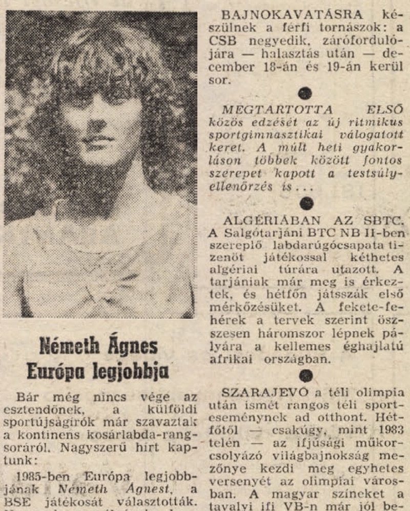 Németh Ágnes 367-szeres válogatott kosaras, ezzel nemzeti csúcstartó, a moszkvai olimpia negyedik helyezettje, négyszeres Európa-bajnoki bronzérmes. 1985-ben az év női játékosának választották Európában, 2021-ben pedig bekerül a világ legjobb kosarasai közé, a Hírességek Csarnokába.