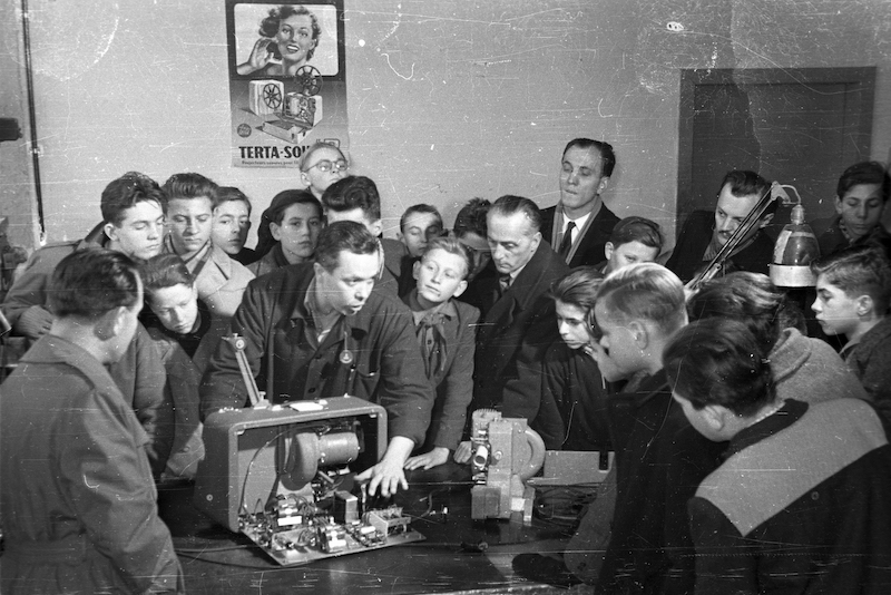1955. Budapest XIV. Hungária körút 126-128., Telefongyár. A gyárlátogatáson résztvevő tanulók és kísérőik a gyárban készülő 16 mm-es filmvetítővel ismerkednek.