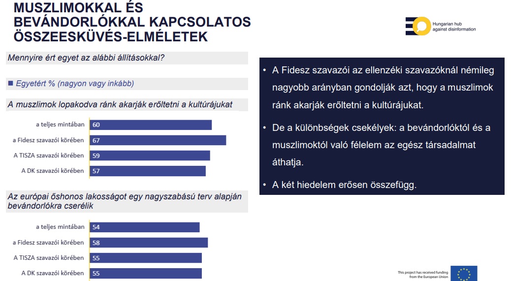 - Magyarországon 60 százalék gondolta úgy, hogy a muszlimok lopakodva ránk akarják erőltetni a kultúrájukat, és olyan nagy eltérés pártpreferenciák alapján sem volt ebben a kérdésben. A bevándorlóktól és a muszlimoktól való félelem az egész társadalmat áthatja.