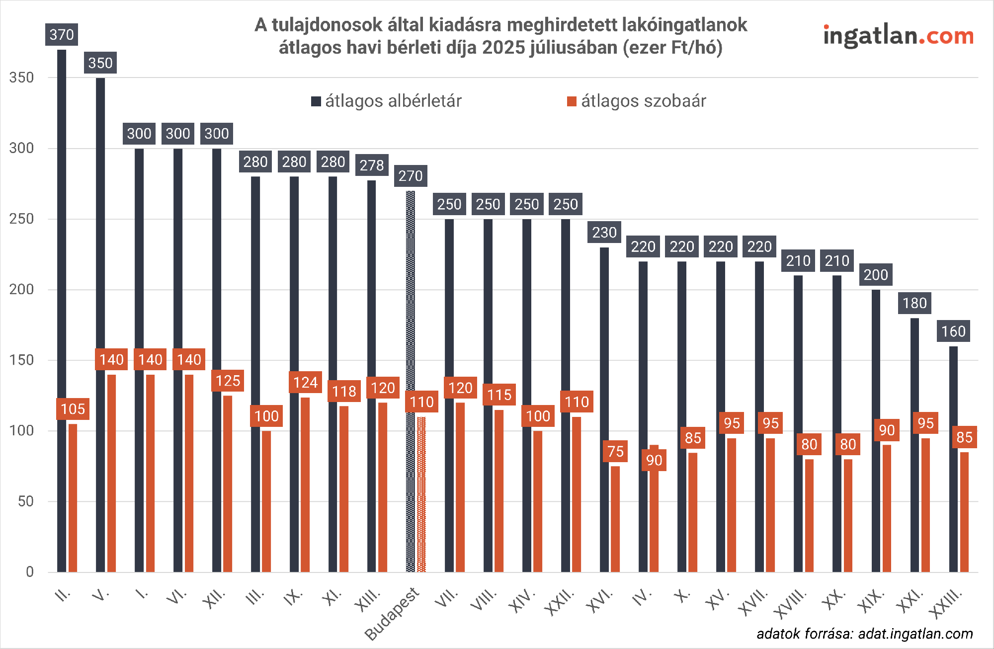 Az egyetemisták körében kedvelt szobabérlés esetén a havi költségek alacsonyabbak, de még mindig jelentősek: Budapesten 110 ezer forintért lehet átlagosan szobát bérelni havonta, és a legolcsóbb külső kerületekben is 75-80 ezer forint az átlagos szobaár egy hónapra. Debrecenben és Szegeden 70-70 ezer forintból jön ki átlagosan egy havi szobabérlés, Győrben 60 ezer, Pécsett viszont 75 ezer forintba kerül ugyanez.