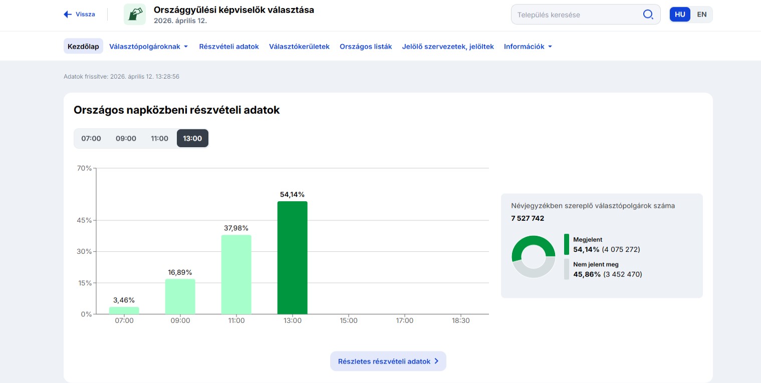 Ez 4 075 272 magyar, ami 997 ezerrel több ember, mint négy évvel ezelőtt. 2022-ben 13 órakor 40,01 százalékos volt a részvételi arány.