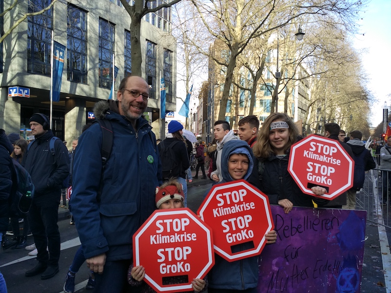 A tüntetés alatt aktivisták a „Stop Klímaválság, Stop Nagykoalíció!” táblákat ezrével osztogatták. Ez újabb nyílt politikai üzenet, amellyel a kormányzó CDU-t és SPD-t támadta a Fridays for Future. Emellett hozzá lehetett jutni a beszédes nevű Vörös Zászló (Rote Fahne) kiadványhoz és megannyi más, alapvetően baloldali értékeket propagáló szórólaphoz. Ha azonban a klímaváltozás közös ügyünk, helyes-e, hogy egy világnézet ennyire kisajátítja magának? Ezt a kérdést tettem fel Thomasnak, aki a Parents for Future, vagyis a Szülők a Jövőért nevű szervezet egyik vezetője Kölnben. Ő nem látta ennyire egyoldalúnak a demonstrációt.