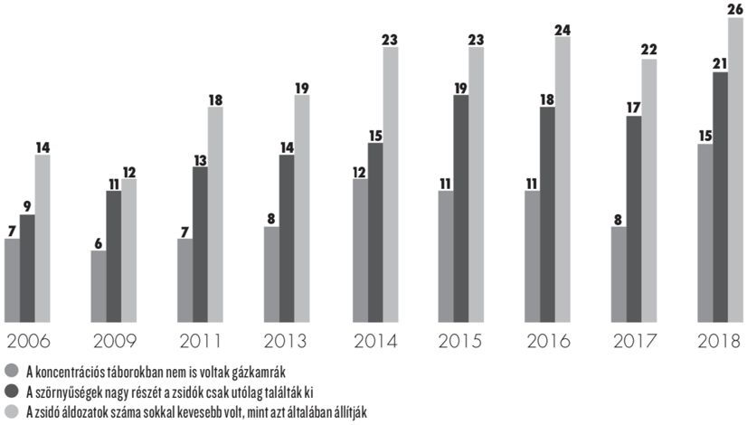 Amiben eléggé romlott a helyzet, az a holokauszt-tagadás és -relativizálás; ez az egész világon probléma, ahogy Magyarországon is. A magyar felnőtt népesség negyede ért egyet azzal, hogy a zsidó áldozatok száma sokkal kevesebb volt, mint ahogyan állítják – ezt nevezik holokauszt-relativizálásnak. Tizenöt százalék ért egyet azzal, hogy a koncentrációs táborokban nem is voltak gázkamrák – ezt pedig egyértelmű holokauszt-tagadásnak. Utóbbi kimondottan nőtt az elmúlt egy évtizedben (2011-ben 7 százalék volt).