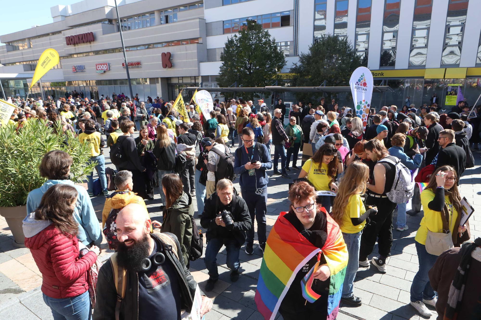 Buzás-Hábel Géza szervező azt mondta: a Pride sajnos nem lehet ma még ünnep, ez most egy kiállás. De a szolidaritás képes kiállni a legnagyobb sötétség ellen is. Szerinte kemény időket élünk, a világ a feje tetejére áll, a szomszédunkban háború dúl, a Közel-Keleten népírtás szemtanúi lehetünk, a történések félelemet és dühöt hoznak magukkal, és ilyenkor még fontosabb, hogy emlékeztessük magunkat: a béke, a szabadság és az emberi méltóság nem lehet alku tárgya.