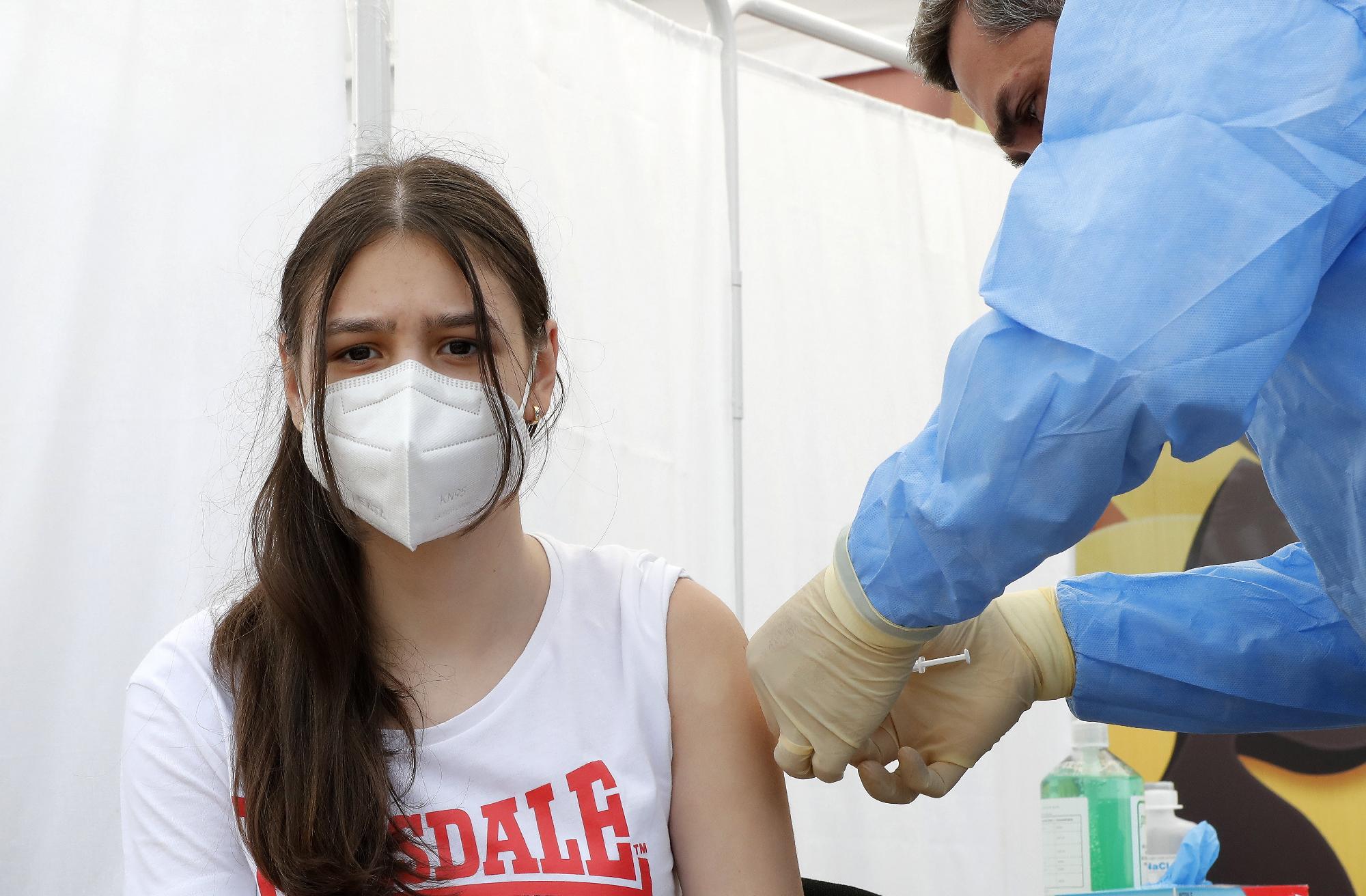 Bukarest, 2021. június 2. Anna, egy román lány megkapja az új koronavírus elleni szérumának első adagját Valeriu Gheorghita katonaorvostól, az oltási kampány koordinátorától a gyermekek oltóközpontjában, a bukaresti Gyermekek Világa Parkban 2021. június 2-án. Romániában ezen a napon kezdődött meg a 12 évesnél nagyobb gyermekek oltása a koronavírus ellen. MTI/EPA/Robert Ghement