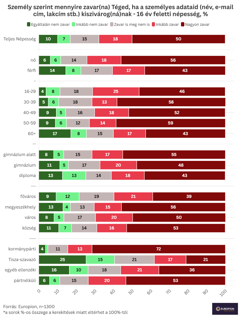 Feltehetően a kérdés kontextusának is betudható, hogy annak is igen pártos a megítélése, mennyire zavarná az egyes válaszadókat, ha személyes adataik nyilvánosságra kerülnének. A kormánypárti tábor több mint kétharmadát (71%) ez nagyon zavarja vagy zavarná, míg a Tisza-szavazók közül csak 21% nyilatkozott így (40%-ukat pedig egyáltalán nem, vagy inkább nem zavarná egy ilyen eset). Ebben a kérdésben azonban a többi ellenzékiek és a pártnélküliek inkább a kormánypárthoz állnak közelebb: az előbbiek 57%-át, utóbbiak 73%-át zavarná, ha a saját adataik lennének érintettek.