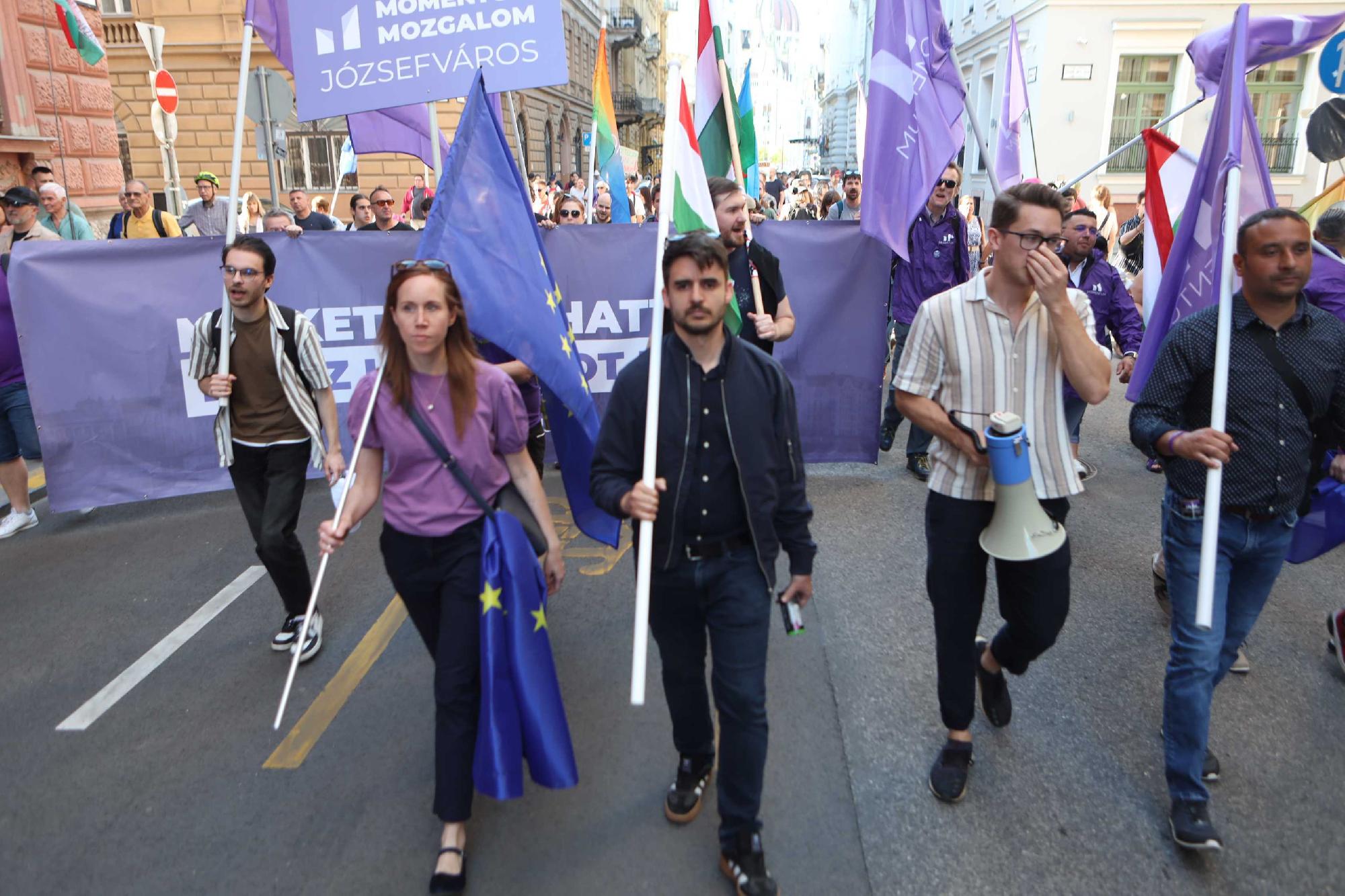 Miközben Hadházy Ákosék elindultak a Margitszigetre, a Momentum képviselői a "Gyülekezés alapjog!"-ot megafonba skandálva elindult a Karmelita felé.