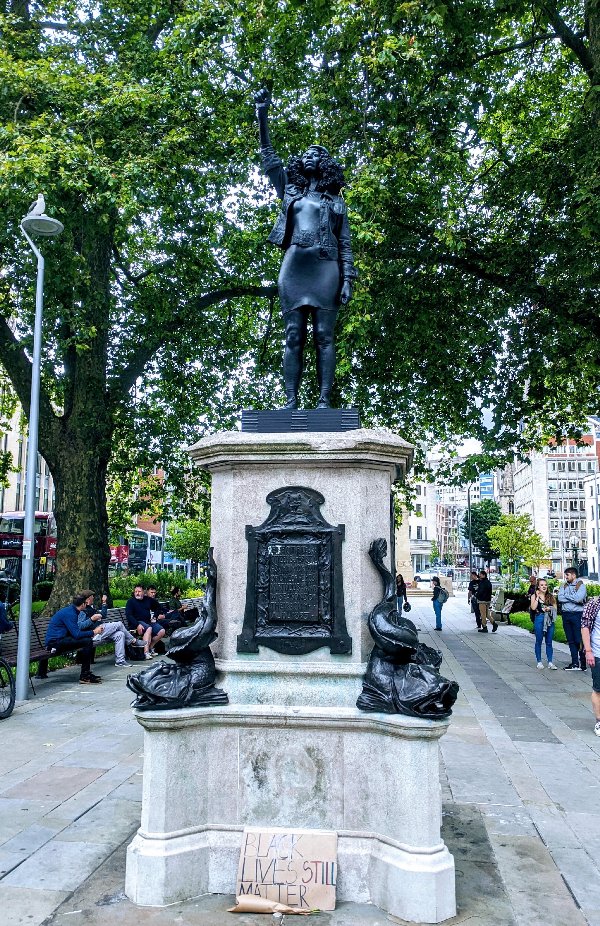 Nem sokáig maradt üresen Bristolban a 17.századi rabszolgakereskedőt, Edward Coltont fényező szobor talapzata azután, hogy az angol város fejlesztésére amúgy sokat áldozó polgár emlékművét ledöntötték. A szobor helyére egy szobordöntő került, egy fekete lány, Jen Reid alakja, aki júniusban felmászott Colton helyére, és onnan a Fekete Hatalom kézjelével üdvözölte a boldogabb jövőt. Ökölbe szorított tenyér, felemelt jobb kéz.