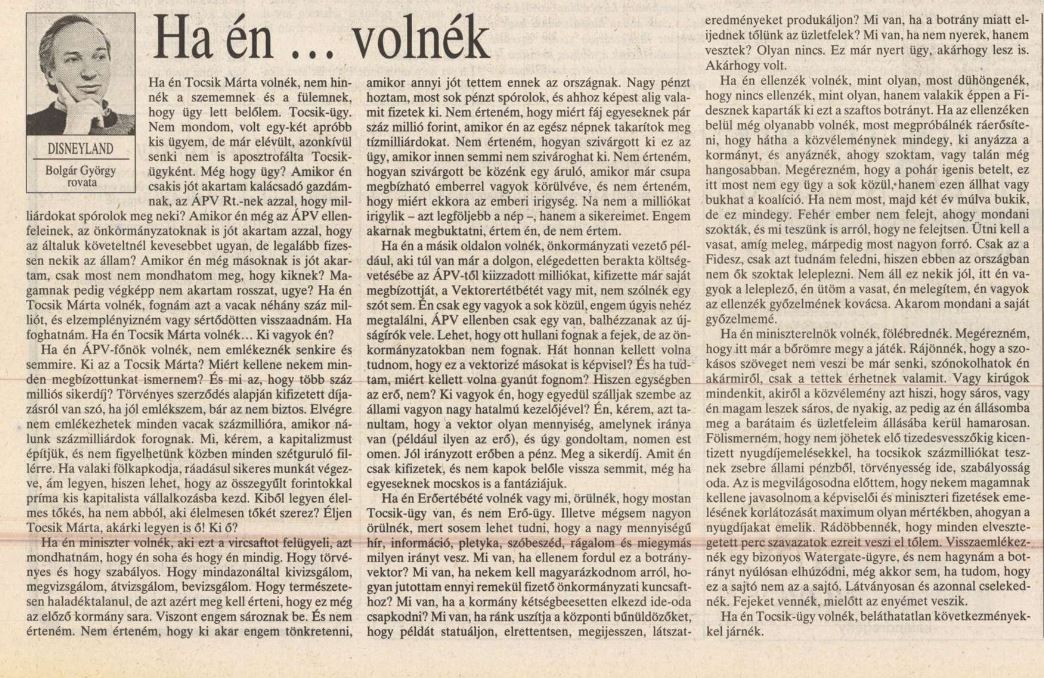 "Ha én miniszterelnök volnék, fölébrednék. Megérezném, hogy itt már a bőrömre megy a játék. Rájönnék, hogy a szokásos szöveget nem veszi be már senki, szónokolhatok én akármiről, csak a tettek érhetnek valamit. Vagy kirúgok mindenkit, akiről a közvélemény azt hiszi, hogy sáros, vagy én magam leszek sáros, de nyakig, az pedig az én állásomba meg a barátaim és üzletfeleim állásába kerül hamarosan" – idézte Kéri László, majd feltette a műsorvezetőnek, Bolgár Györgynek a kérdést, hogy ezt ki és mikor írhatta.