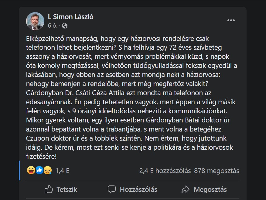A Fidesz politikája átgondolatlan, nem egyeztettek a szakemberekkel a járványkezelések során – véli Komáromi Zoltán. A DK egészségpolitikusa szerint L. Simon védekezése így meglehetősen "butácska", hiszen a háziorvosok a járványügyi rendeletek alapján kénytelenek végezni munkájukat.