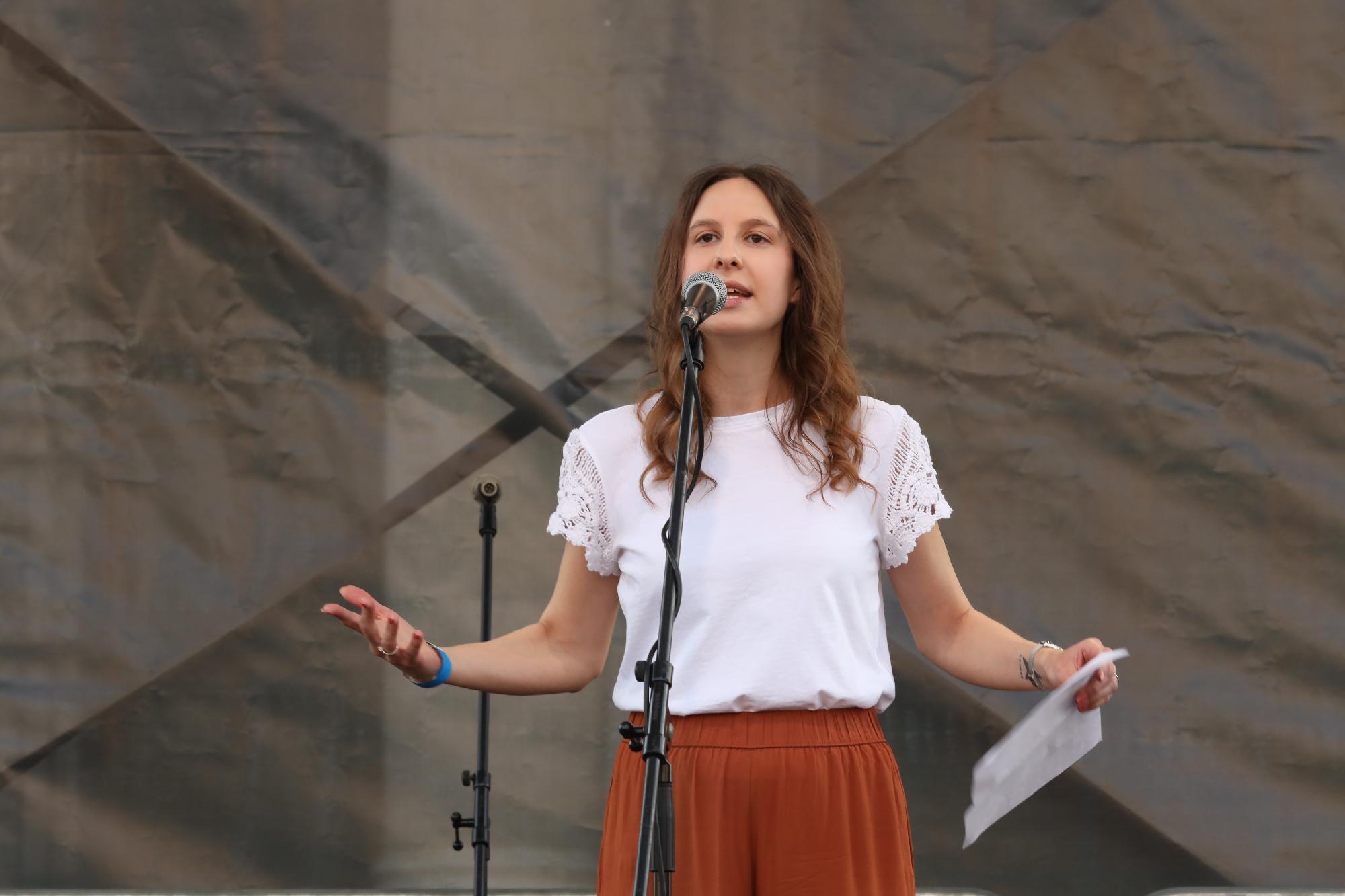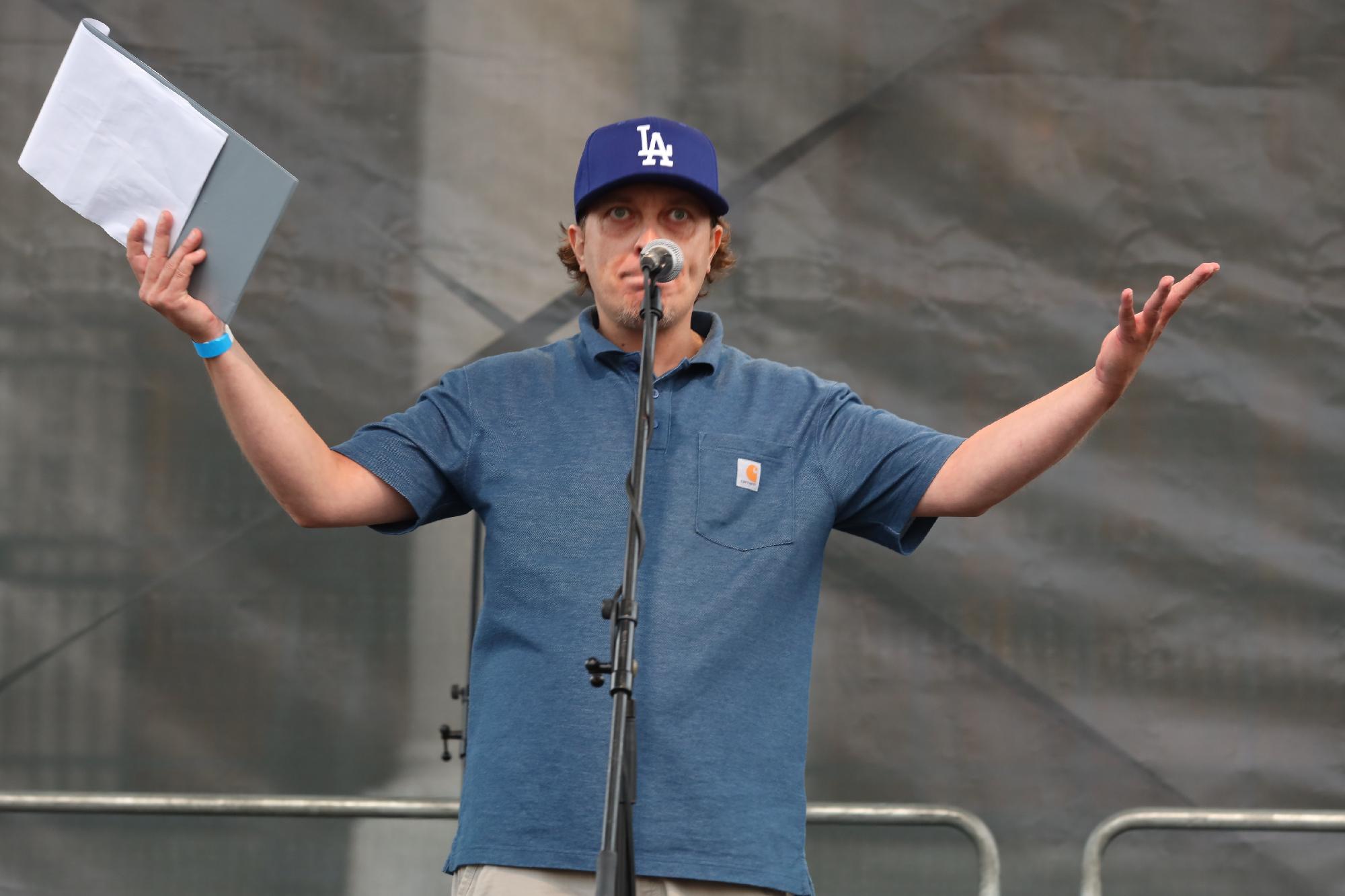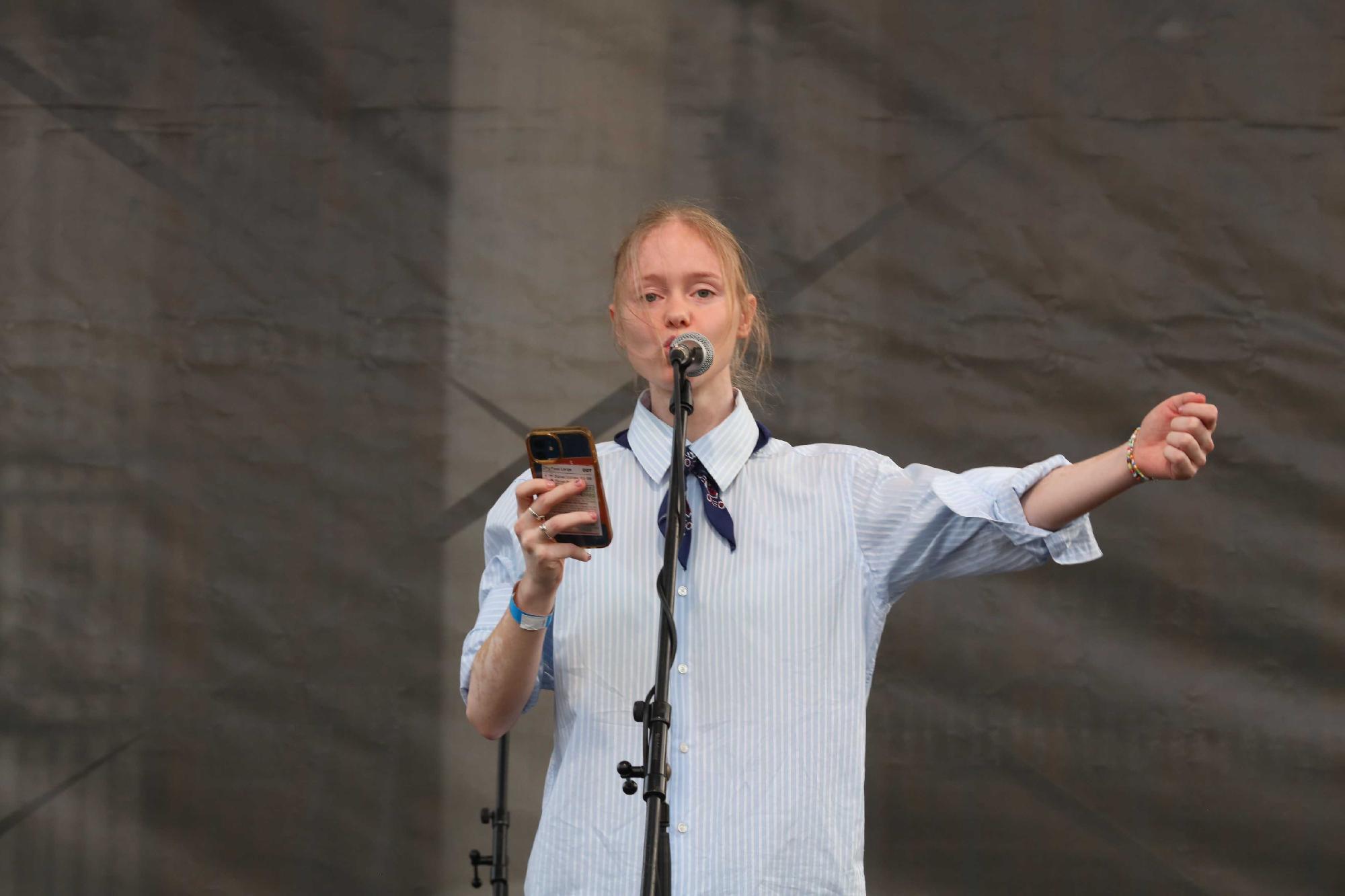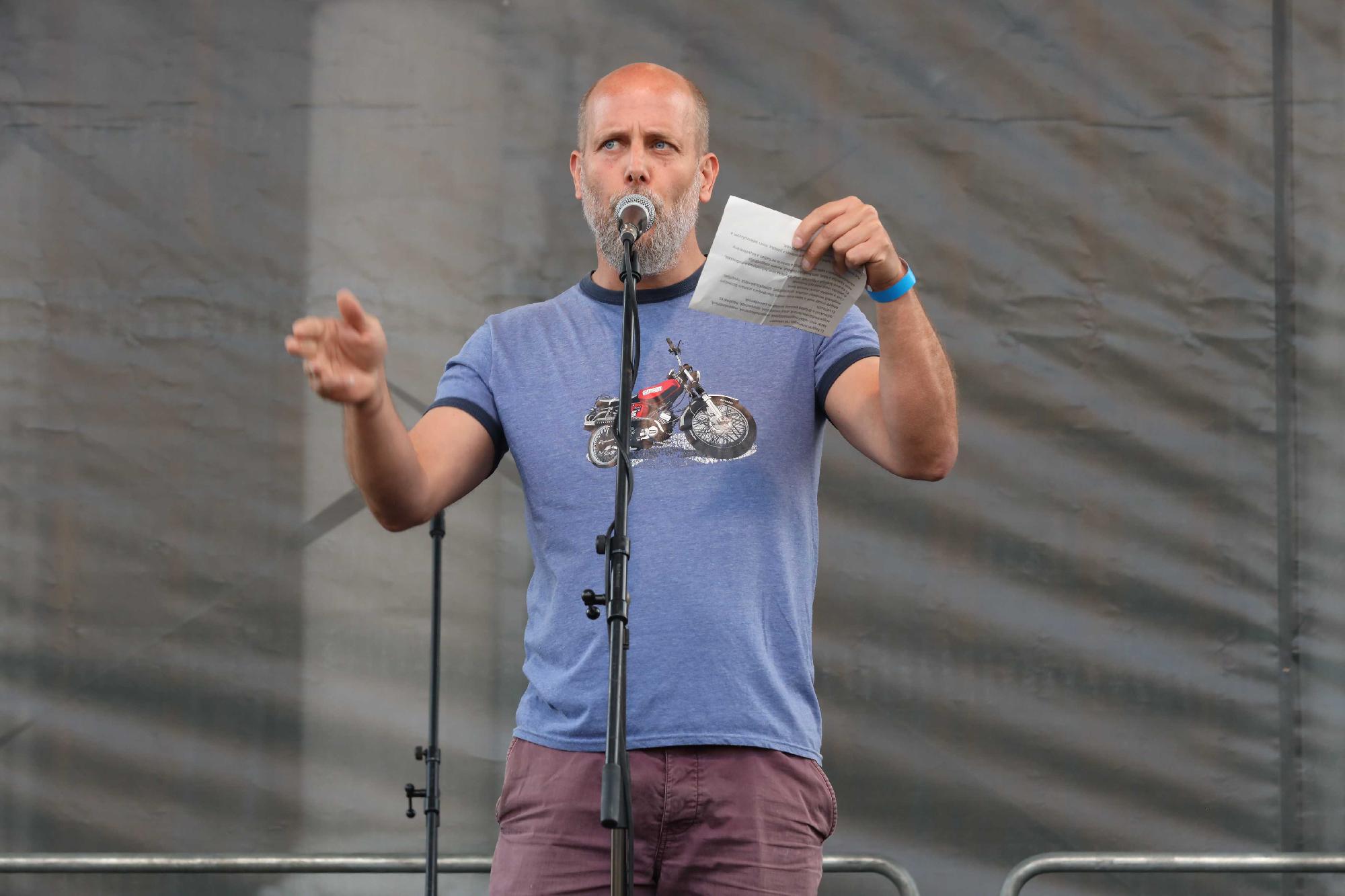 Pajor Tamás félig rappelve, szabadversben beszélt, többek között uncsi Gucci-bárókról. A beszédek között egyébként is több vers és dal elhangzott, gitározott Lovasi András, Csákányi Eszter pedig például videóüzenetet küldött, ő Erdős Virág Szóljatok c. versét mondta el.
