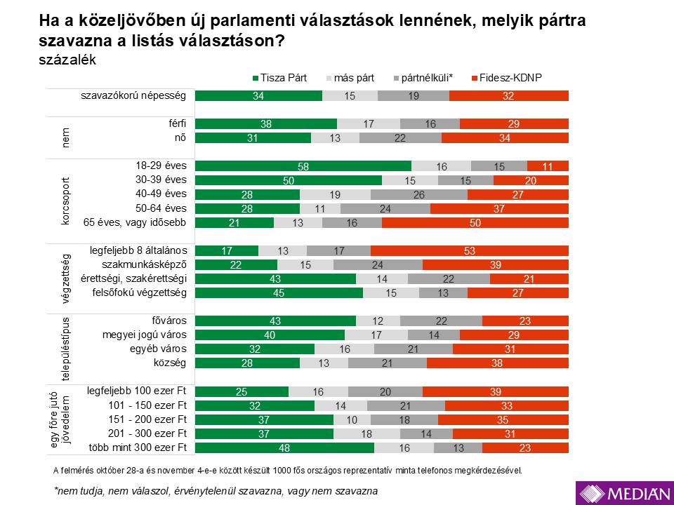 A fiatalok, a legalább érettségivel rendelkezők, a férfiak, a nagyobb városokban lakók és a magasabb jövedelműek körében vezet a Tisza a Fidesszel szemben. Sőt, a 40 év alattiak körében az abszolút többség is a Tiszára voksolna egy közelgő választáson.