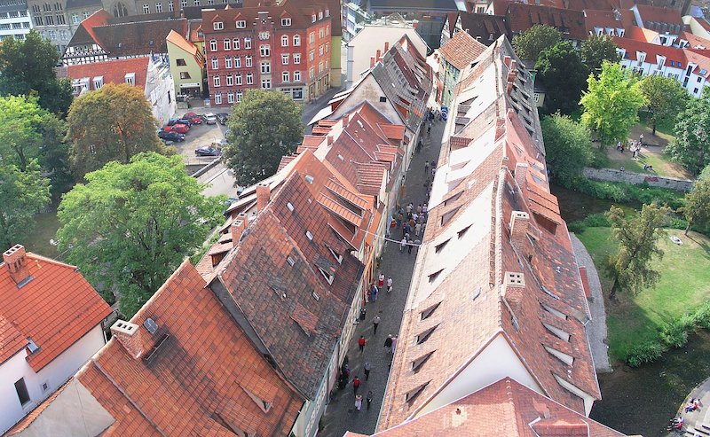 Hogy megértsük ennek a hídnak a fontosságát a település életében, érdemes a város nevére gondolnunk. Erfurtot már a 700-as években is említik Erphesfurt alakban. A kifejezés első fele (erphes) állítólag barna vizet jelent, de a második tagja (furt) az a mai németben is gázlót. Vagyis azért jött éppen itt létre ez a város, mert itt lehetett legkényelmesebben átkelni a Gera folyón. Hasonló eredetre utal amúgy az angliai Oxford elnevezés is, hiszen az ox ökröt, a ford – akár csak a német furt – gázlót jelent. Vagy Németországban maradva, ott van Frankfurt, a „frankok gázlója”. Elképesztő belegondolni, hogy Európa pénzügyi és kereskedelmi központja azért van ott, ahol van, mert ezen a helyen volt a víz elég sekély ahhoz, hogy át lehessen kelni a Majnán. Azután egyszer csak egy élelmes kereskedő felállított egy bódét a forgalmas átkelőhelyen a folyó partján, amiből mára hipp-hopp, egy két és fél milliós metropolisz magja született meg. Na de vissza Erfurtba és a középkorba!