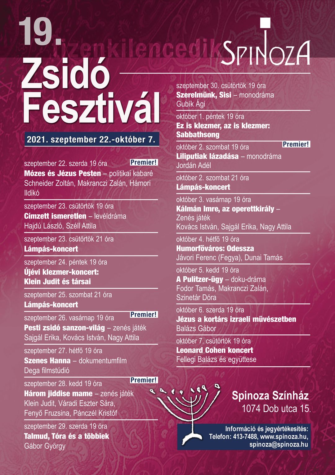 11:00 Szeptember 22-én kezdetét veszi a 19. Spinoza Zsidó Fesztivál. Vajon mit szólna a holland filozófus, Spinoza a róla elnevezett fesztiválról? Sándor Anna, a színház igazgatója, a fesztivál megálmodója így gondolja: „Hogy szülővárosától, Amszterdamtól 1500 km-re rólam neveznek el egy kulturális helyet? Nahát! És hogy domborművem van a ház falán? Megkérdezné, hogy a dombormű alá sok okos mondatai közül miért épp azt választottam, ami ott van a Dob utca 15. falán. Végignézve a műsorunkat pedig megdicsérne, amiért a legtöbb program a nyílt, szabad szellemről árulkodik.”