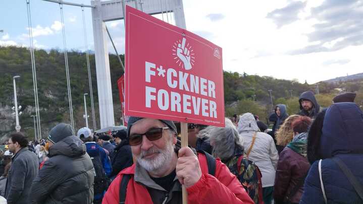 "Mocskos Fidesz!" “Fasiszta diktátor!” “Orbán Viktor, a kurva anyád!” – hangolt a közönség az Erzsébet hídon a gyülekezési törvény módosítása (vagy ahogy Hadházy Ákos meghirdette: a technofasizmus) ellen szervezett negyedik tüntetésre,