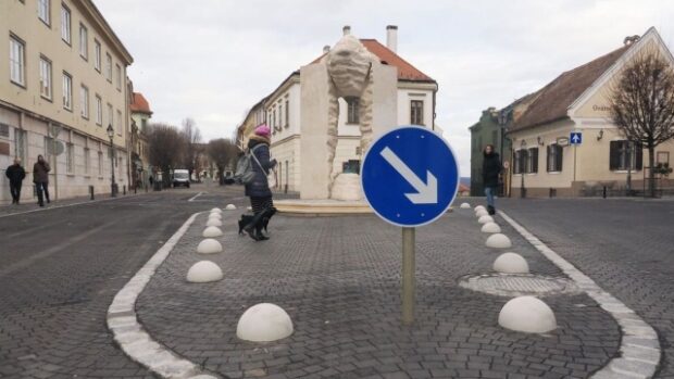 Nyilvánvaló volt, hogy a sebtében áttelepített, a környezetéhez képest ormótlan műtárgy akadályozni fogja a közlekedést. Körbekerítették félgömb alakú akadályokkal, figyelmeztetvén a járművezetőket, hogy be kell férniük a forgalomba. De nem fértek be. Az akadálypályán a talapzat letöredezett a gépkocsik átgázoltak a félgömbökön, vagy kiütötték azokat a helyükből. A polgármester szerint "kezdődik az idén felújított Szabadság tér garanciális javítása". Egy évet bírt ki. Ismét feltúrják a teret, de ne aggódjon a polgár, ez nem kerül pénzébe, garanciális a javítás – írja a Veszprém Kukac.