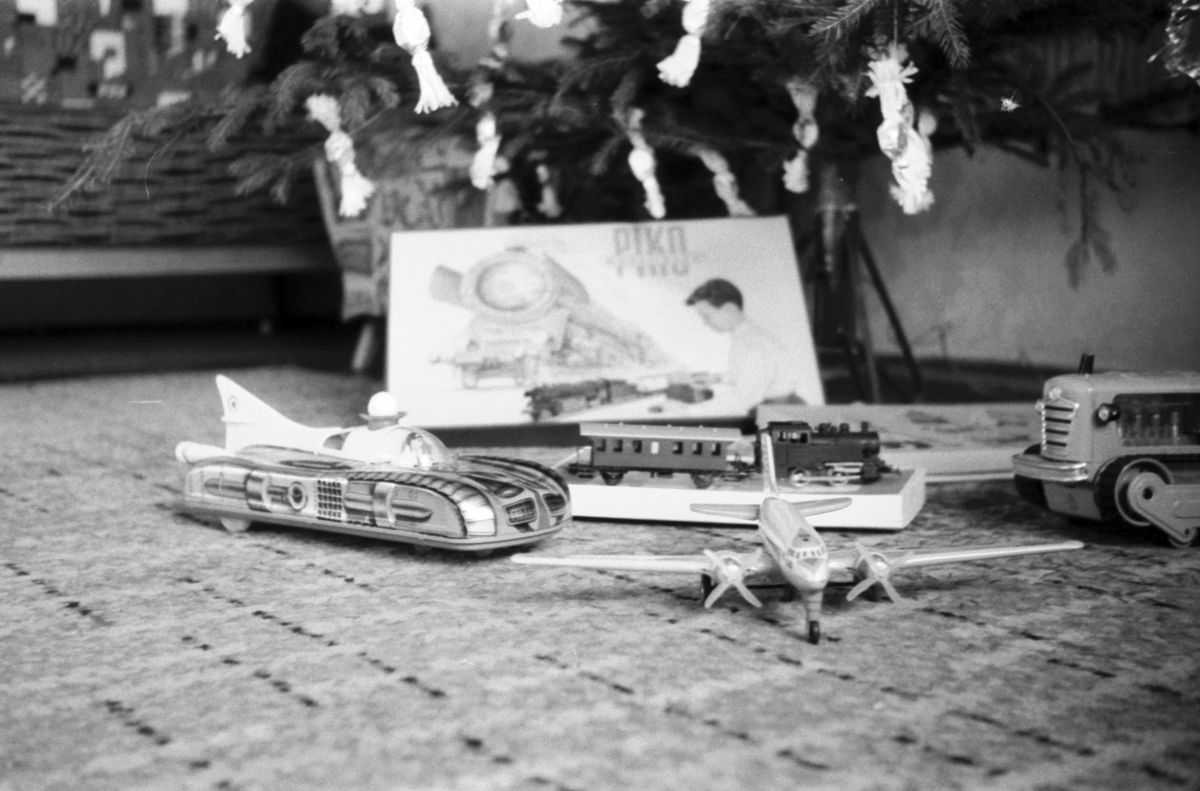 Karácsony 1965. A Budapesti Lemezárugyár játékai és egy PIKO villanyvasút (forrás: Fortepan/Beyer Norbert)