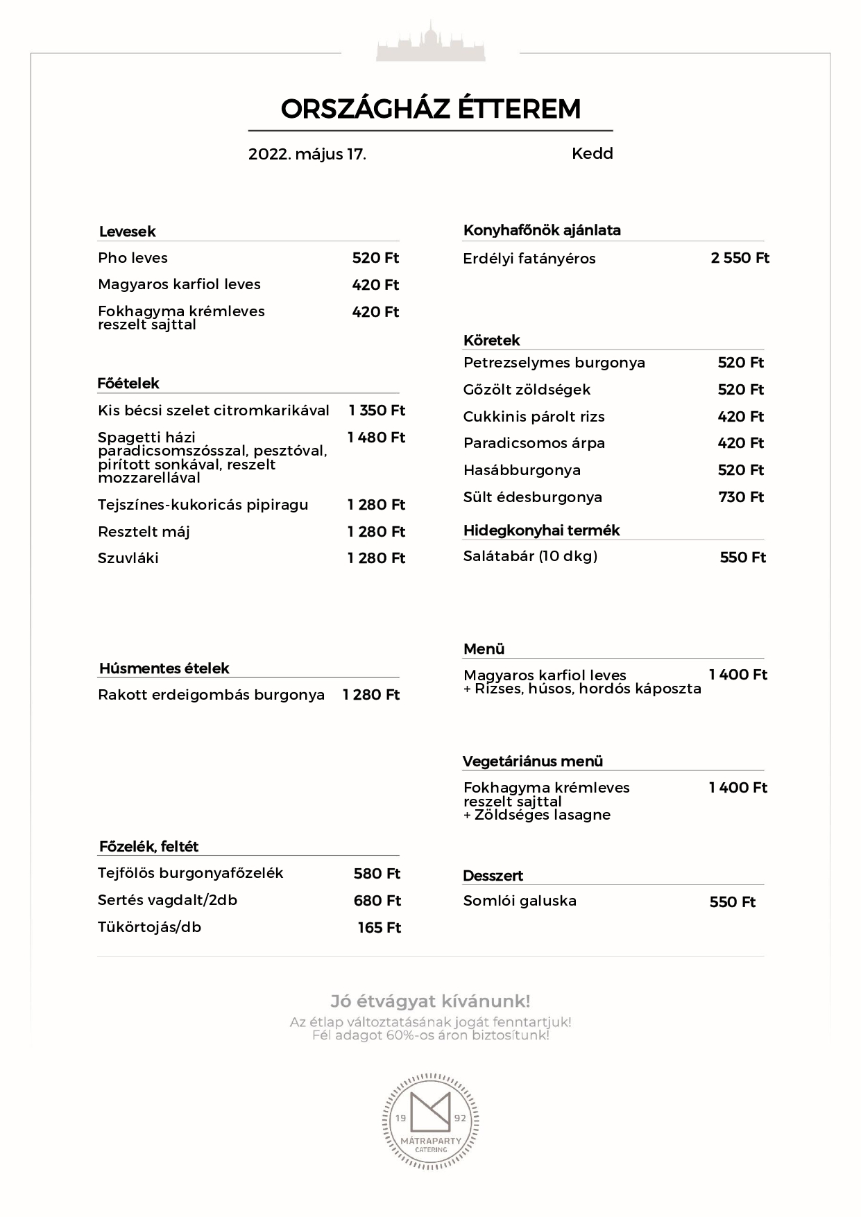 A Parlament oldalán viszonylag rövid keresgélés után megtalálható egy korábbi, 2022. májusi étlap is.