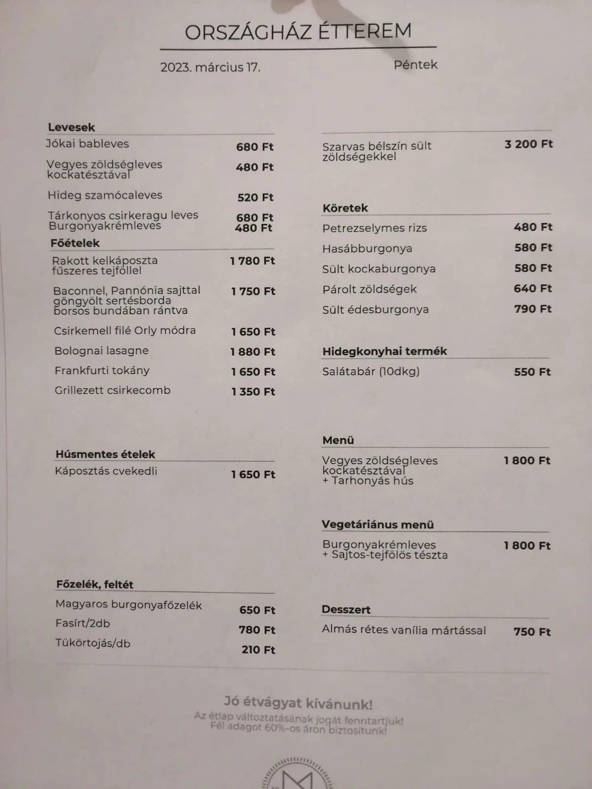 Pár napja jelent meg az Országház alagsorában működő étterem március 17-ei étlapja. Első ránézésre feltűnhet, hogy a kínálat legalábbis nagyon kedvező árszabású. Olyan alacsony árfekvésről beszélünk, amilyennel csak nagyon kevés helyen találkozhatunk Budapesten.