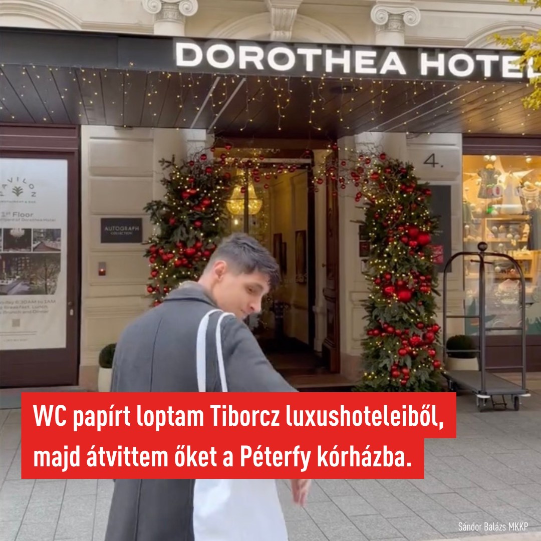 A Marriott Hotel, a Dorothea Hotel, a D8 Hotel és a Verno House – ezeket a Tiborcz István-érdekeltségű hoteleket látogatta végig a Magyar Kétfarkú Kutya Párt egyik politikusa, Sándor Balázs. Begyűjtötte a mellékhelyiségekben található WC-papírt, és úgy, ahogy van, a csomaggal átment a Péterfy Sándor utcai kórházba, ahol egy darab tekercs nem volt, és elhelyezte a mosdóban.