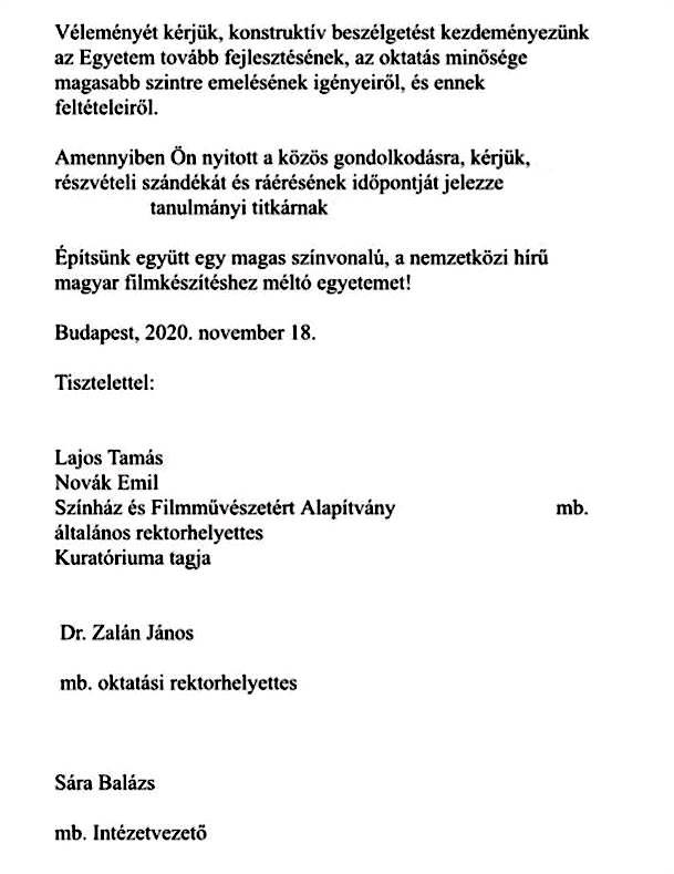 A Lajos Tamás, Novák Emil, valamint Zalán János vezette csatársor, kiegészítve egy új, odapottyintott intézményvezetővel, Sára Balázzsal, mindenképpen megújítani látszik az oktatást. Most a kabaré műfajában alkottak nagyot, amikor egy igen vicces levélkében hívják találkozóra a kollégáikat. Nem, ezt nem Tolsztoj írta. A vicc egyik eleme, hogy tréfás helyesírási hibákat helyeztek el a pár soros szövegben, és – ezt Fülig Jimmy óta tudjuk – nem lehet nevetés nélkül megállni. És az is igazán tréfásra sikeredett, ahogy a hivatali bikkfanyelvet parodizálják – mert nyilván parodizáljak, így ugyanis írni-olvasni tudó ember, főleg egy ilyen felsőoktatási intézményben, nem ír, nem beszél. Szerintem Gálvölgyi művész úrtól irigyelték el a sikert. Szóval nyilván kiapadhatatlan humoruk része amikor emígyen csavarják és csűrik a magyar szót; kiragadott példa következik: Amennyiben Ön nyitott a közös gondolkodásra, kérjük részvételi szándékát és ráérésének időpontját jelezze xy tanulmányi titkárnak. Építsünk együtt egy magas színvonalú, a nemzetközi hírű magyar filmkészítéshez méltó egyetemet!