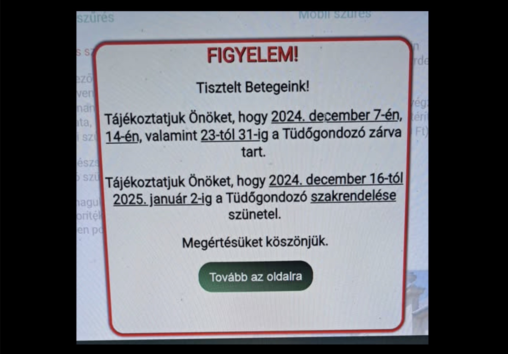 A Veszprém Kukac névtelenséget kérő olvasója juttatta el a veszprémi lapnak azt a hivatalos közleményt, amely szerint Müller Cecília országos tisztifőorvos utasítására, „személyi feltétel hiánya” miatt, december közepétől év végéig Veszprémben szünetel a tüdőgyógyászati rendelés. Jó hír, hogy a betegeket december 23-tól a „tüdőgondozó IV. elnevezésű szervezeti telephelyén” látják el. A “telephely” a Farkasgyepűi Tüdőgyógyintézetet, ám annak honlapja szerint az is zárva lesz az ünnepek alatt.