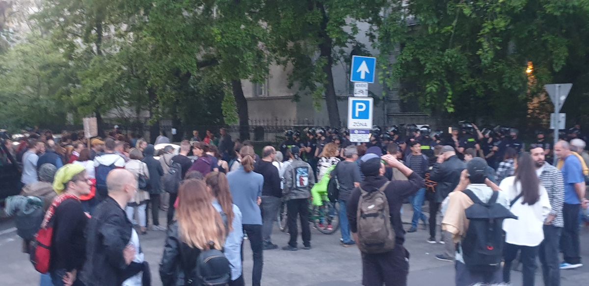 A rendőrség állítása szerint a Fidesz-székházhoz vonuló tüntetők "szándékosan provokálnak", lökdösni, tolni kezdték a rendőrsorfalat, és megpróbálták áttörni azt, közben palackkal is dobáltak, de egy vascsavarról is közreadtak képet a közleményükben. Háromnegyed kilenc körül megindult a rendőrök rohama, kiürítették a területet a saroknál, ék alakban kettéválasztva a tüntetőket. „Szégyelld magad!” – skandálták utóbbiak válaszul.