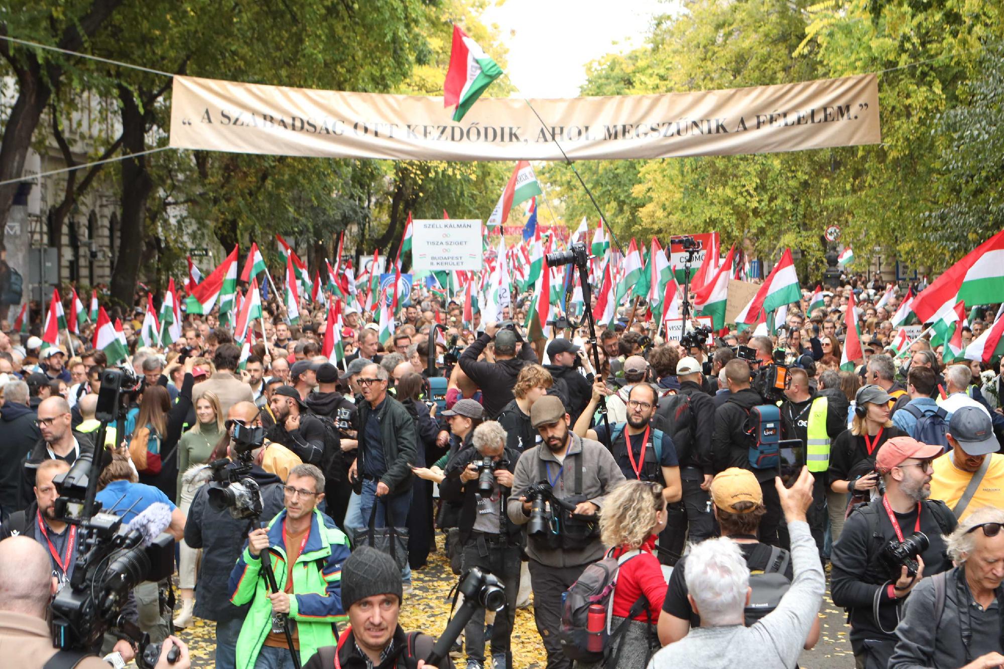 Fél háromkor elindult el a Tisza Párt október 23-i menete is Budapesten. A Nemzet Menet nevű rendezvény résztvevői a Deák térről az Andrássy úton át a Hősök tere felé vonulnak. Mikor a menet eleje már félig megtöltötte a Hősök terét, a vége még mindig a kiinduló pont Deák téren volt. A menet útvonalán végig tömött nem csak az úttest, hanem a járdák is.