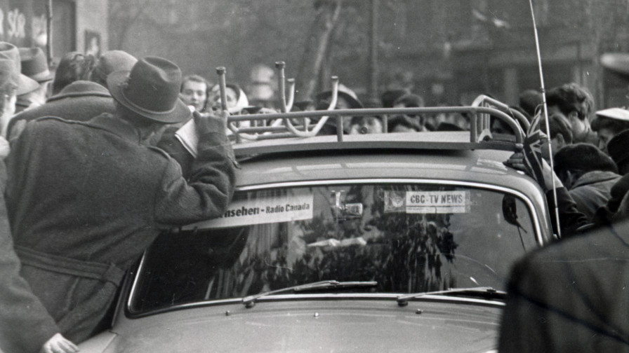Oktogon (November 7. tér), a kanadai CBC televízió és rádió tudósítóinak Mercedes típusú személygépkocsija (Fotó: Fortepan / Virány László)Hamarosan megérkeztek a nagy nemzetközi hírszolgálatok stábjai is. Az osztrák Fox Híradó operatőre, Otto Pammer több alkalommal is visszatért Magyarországra, és az ő felvételei révén a nyugati világ elsőként láthatta a magyar felkelés képeit. A CBS és az NBC amerikai forgatócsoportjai szintén jelen voltak Budapesten; az előbbiek a Corvin közben dolgoztak, az utóbbiak pedig Mindszenty Józsefet és Nagy Imrét is rögzítették.