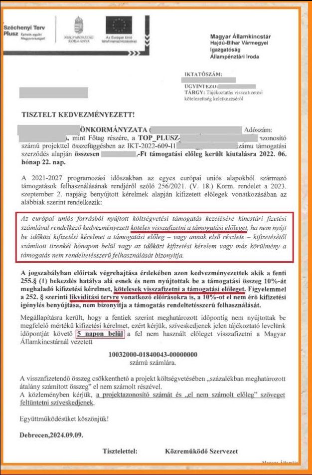A független országgyűlési képviselőnek több helyről el is küldtek erről szóló rekviráló levelet. A kormány ugyanis úgyis elkezdte osztogatni a pénzeket, hogy az EU-s forrásoknak csak egy kisebb része érkezett meg az országba. A falvaknak előlegeket is osztott, egyelőre saját pénzből - ezt követelik most vissza egy rendeletre hivatkozva. Hadházy szerint ezzel a lépéssel a központi költségvetés gyalázatos állapotát akarják kozmetikázni. Az alábbi szerződést mellékelte a képviselő, mely mások mellett eljutott hozzá.