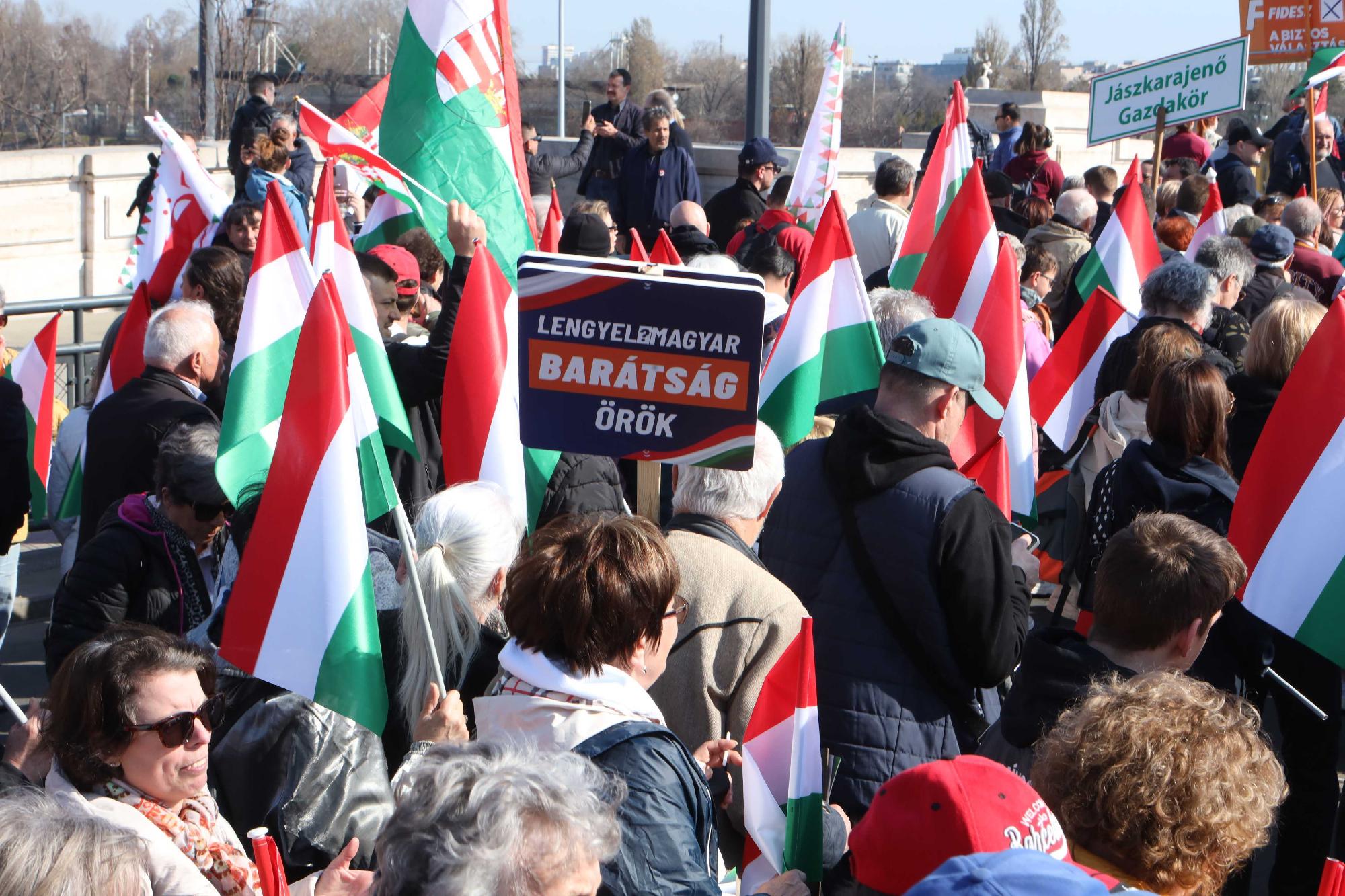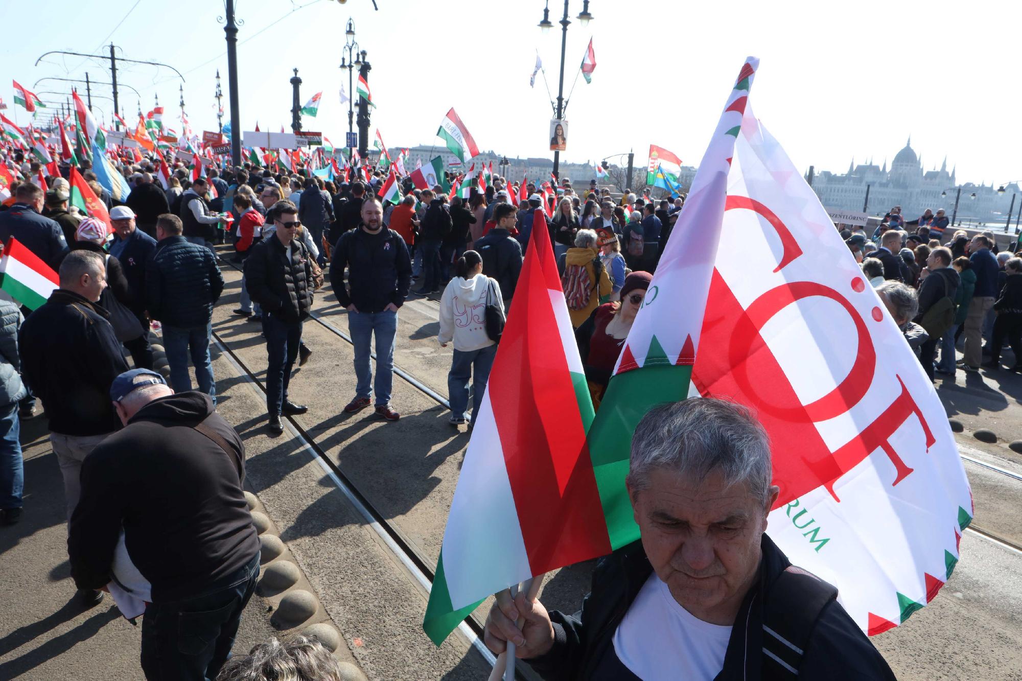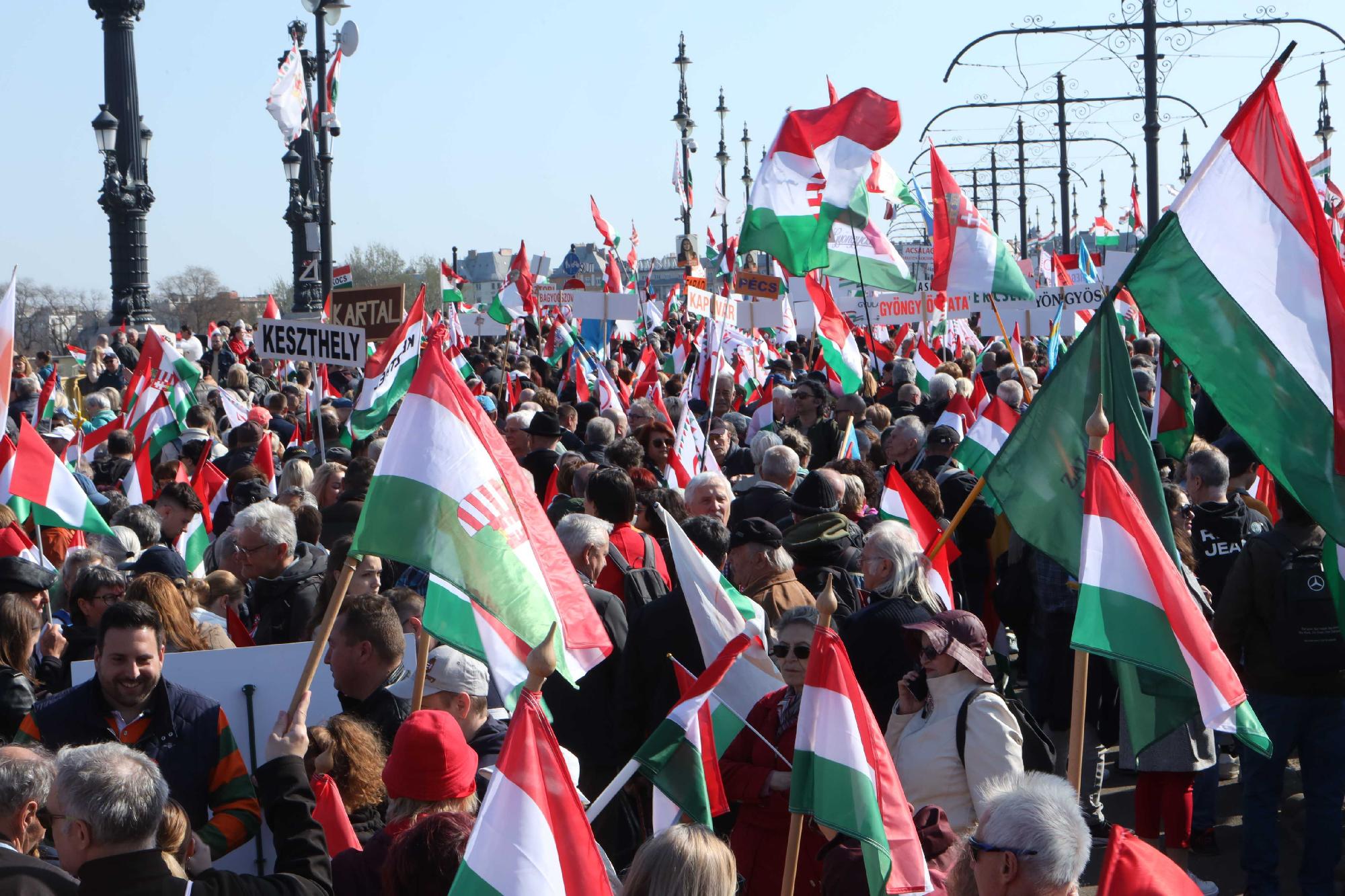 Elindultak a fővárosi Margit hídon Pest felé a Fidesz-KDNP támogatására szervezett, Békemenetnek nevezett demonstráció résztvevői. Az átkelő budai oldala közelében, az Elvis Presley téren reggel 9 óra óta gyülekező kormánypárti tömeg várhatóan a Jászai Mari téren, a Szent István körúton, a Bajcsy-Zsilinszky úton, majd az Alkotmány utcán át az Országház előtti Kossuth térre fog vonulni. A Klubrádió információi szerint a körút mellékutcáit, amelyeken keresztül levágható az útvonal, és rövidebb úton közelíthető meg a Parlament, a szervezők lezárták, hogy mindenkit a fő vonulási útvonalon tartsanak.