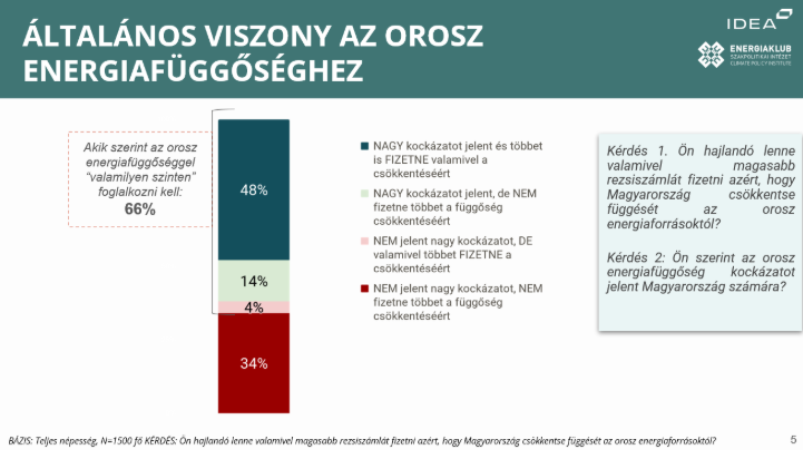 A népesség csaknem fele (48%) akár még egy kicsit többet is fizetne az általa használt energiáért, ha ezzel hozzájárulhat e függőség csökkentéséhez. A felmérésből az is kiderült, hogy a magyar felnőttek többsége tisztában van vele, hogy az ország energiaellátása problémákkal küzd, kihívások előtt áll. A teljes népesség zöme (78%) tisztában van vele, hogy Magyarország energiaellátása nagyon erősen függ Oroszországtól és lakosság kétharmada ezt kockázatosnak (62%), hátrányosnak gondolja.