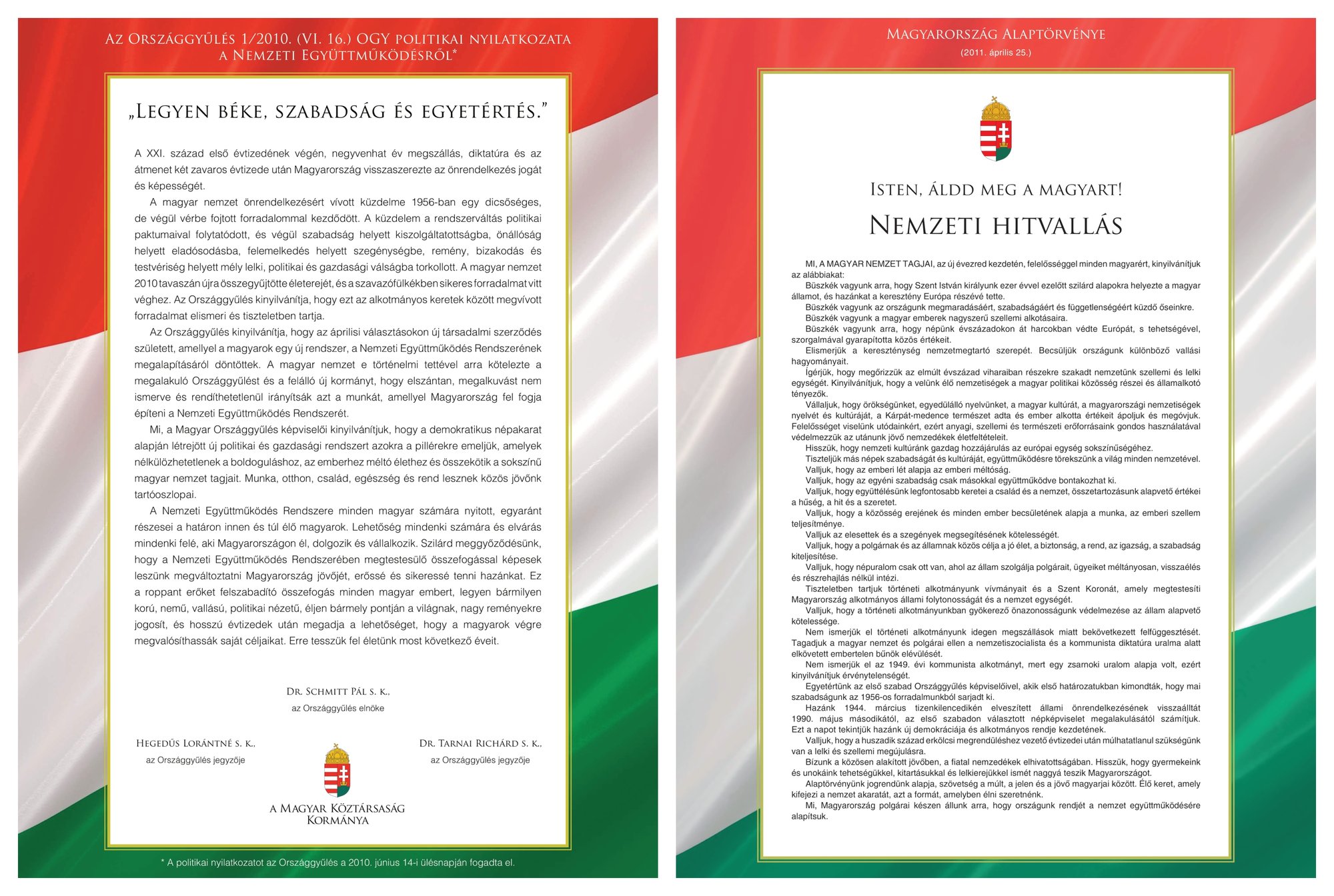 "A Kormány az Alaptörvény 10 éve történt elfogadásának tiszteletére és az Alaptörvény Nemzeti Hitvallásának jelentőségére figyelemmel egyetért azzal, hogy a 2010. évben kihelyezett Nemzeti Együttműködési Nyilatkozatok helyére a középületekben a Nemzeti Hitvallás kerüljön elhelyezésre" – olvasható a Magyar Közlönyben szerda este megjelent kormányhatározatban.