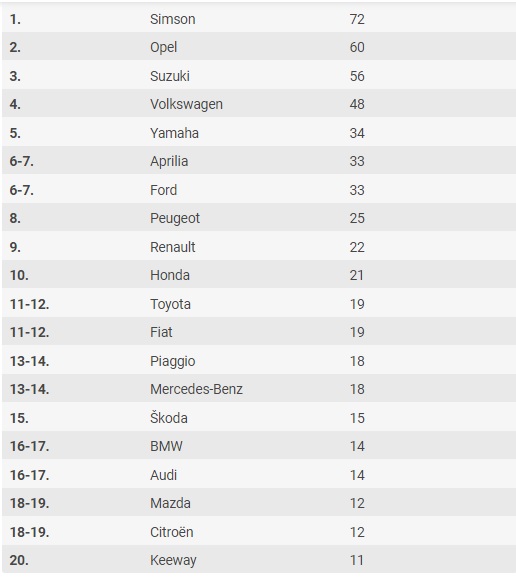 Az Opel a második a lopási listán 60 autóval, míg a Suzuki a harmadik 56 darabbal. A prémium márkák, a Mercedes 18, a BMW 14 és az Audi 14 lopással szerepelnek. Nagyobb változás a listában a Volkswagené, amelyből 40-et vittek el a tavalyelőtti 29-hez képest, míg Fordból például kevesebb mint felére esett a lopásszám tavaly, 56-ról 24-re – írja a Vezess.hu.
