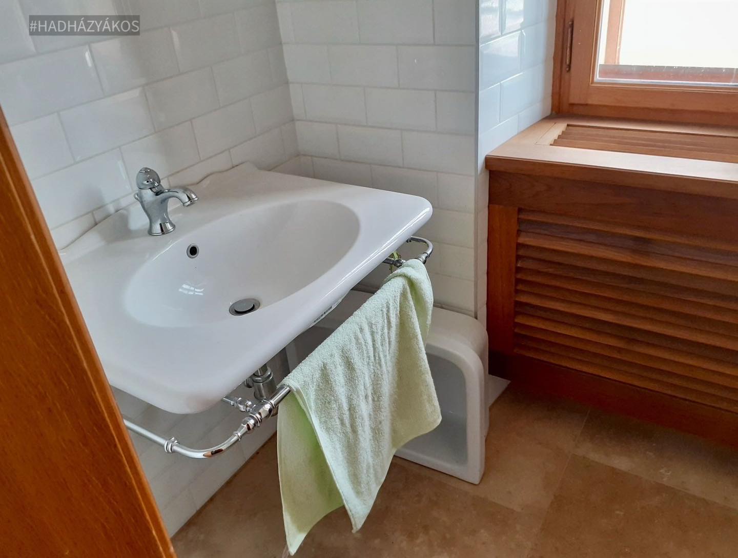 - A vizeshelyiségek ablaka alatt a parapet előtt látható elegáns faburkolat valószínűleg hőszivattyús levegő- levegő rendszer klíma beltéri egységét takarja. A korábbi képeken láthatóak voltak a kültéri egységek, míg más képek alapján állítható az is, hogy a kerámiaburkolatú helyiségekben padlófűtés készült. A padlófűtés mellett szükséges (ezért nem valószínű, hogy radiátor lenne a burkolat mögött) a levegőfűtés is a penészedés miatt kiegészítő fűtésként, nem mellesleg így az ablakokon sem lesz páralecsapódás. Mindkét rendszer természetesen külön-külön is mind fűtésre, mind hűtésre is alkalmas.