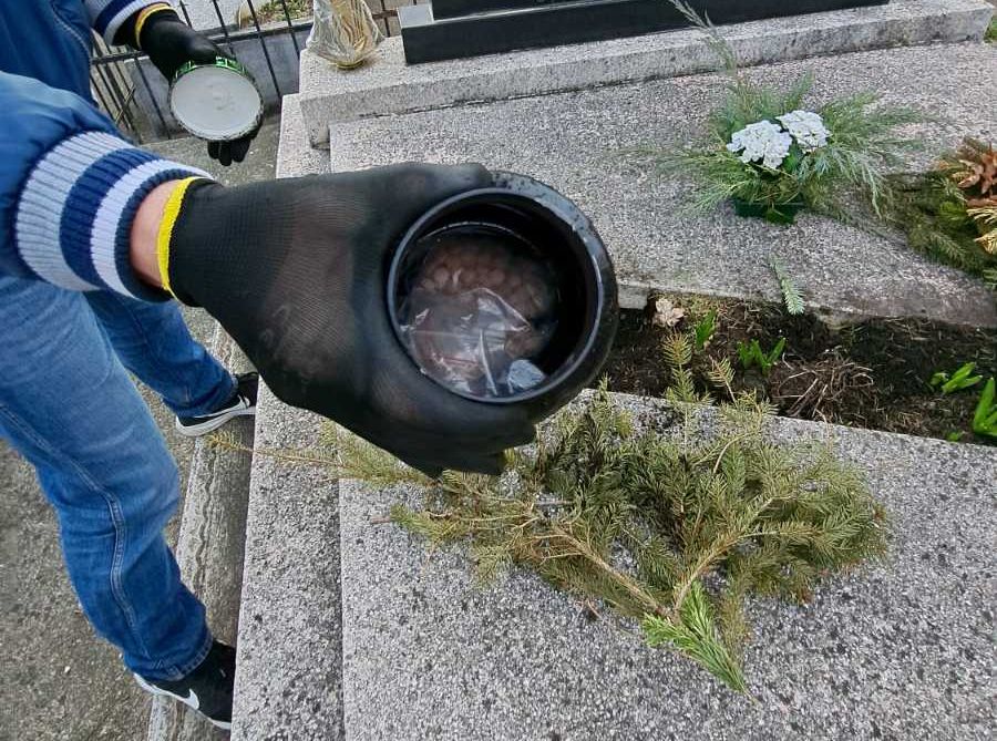 A síremlék koszorúkkal és fenyőágakkal letakart földje alól három kábítószerrel teli műanyagdoboz került elő, miután a rendőrök a nőt elfogták. Az étrendkiegészítős flakonokban összesen közel egy kilogramm fehér por volt, illetve majdnem 300, korona mintájú, rózsaszín tabletta, valamint több száz simítózáras tasak. A gyorstesztek szerint a por amfetamin, a tabletta extasy volt.