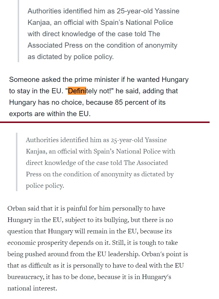 Az Orbánnal tehát szimpátiával viseltető újság az MCC-s háttérbeszélgetésről szóló írásában azt a nem teljesen életszerűtlen párbeszédet is beleírta a cikkébe, amelyben egy közelebbről meg nem nevezett újságíró rákérdezett Orbánnál, ő akarja-e, hogy Magyarország az EU-ban maradjon, amire a magyar miniszterelnök "határozott nemmel" felelt, és hozzátette, nincs más választása, hiszen az ország exportja 85 százalékban az uniós országokkal zajlik.