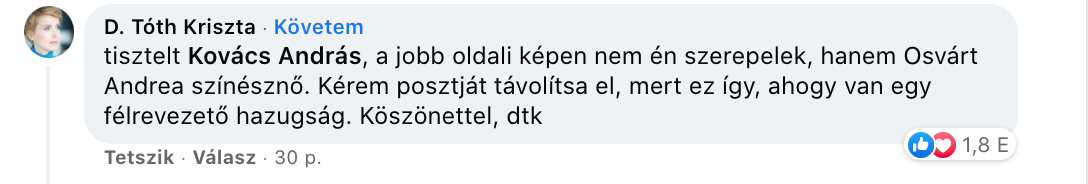 Erről a wmn.hu ügyvezető- és tartalomigazgatója, D. Tóth Kriszta is tájékoztatta Kovácsot a kommentek közt jelezve: „a jobb oldali képen nem én szerepelek, hanem Osvárt Andrea színésznő. Kérem posztját távolítsa el, mert ez így, ahogy van egy félrevezető hazugság. Köszönettel, dtk”