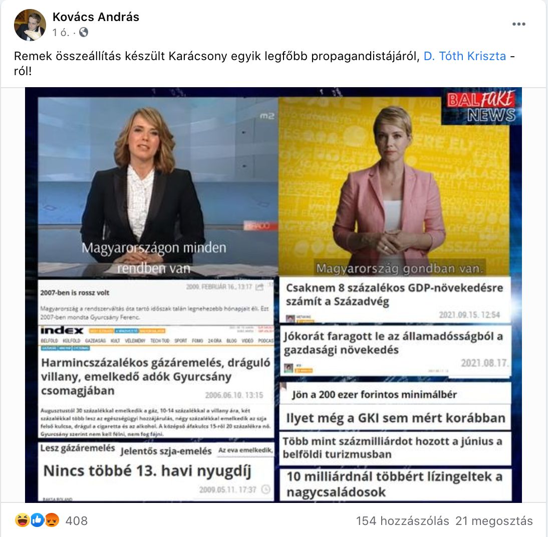 Kovács András, az Origo újságírója Facebookon osztott meg a sarokban egy „BalFake News” felirattal ellátott képet azzal a szöveggel, hogy „Remek összeállítás készült Karácsony egyik legfőbb propagandistájáról, D. Tóth Krisztáról” – írja a 444.