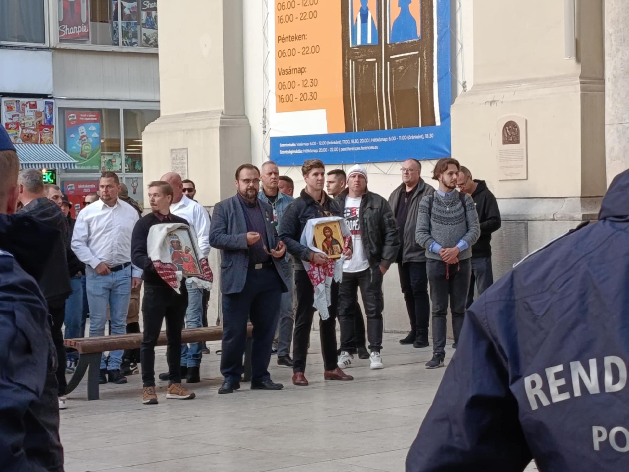 Most azonban harangszó helyett a temlom előtt néhány tucat imádkozó ellentüntető jelent meg. Őket a szokásosnál nagyobb létszámban megjelent rendőrök választották el a demonstráción résztvevőktől, de egyébként sem történt semmilyen attrocitás a két csoport között, minden békésen zajlott. A ferences kolostorból időközben kiérkezett egy templomszolga, aki a rend nevében azt kérte a rózsafűzérezéssel demonstrálóktól, hogy menjenek be a templomba, ne használják fegyverként az imádságot, de nem hallgatták rá – írja a HVG.